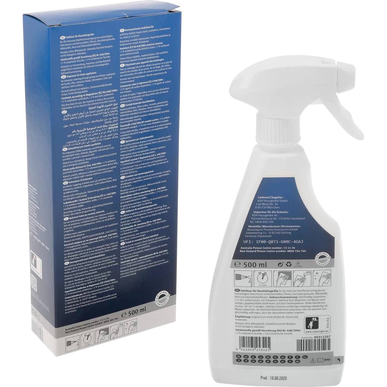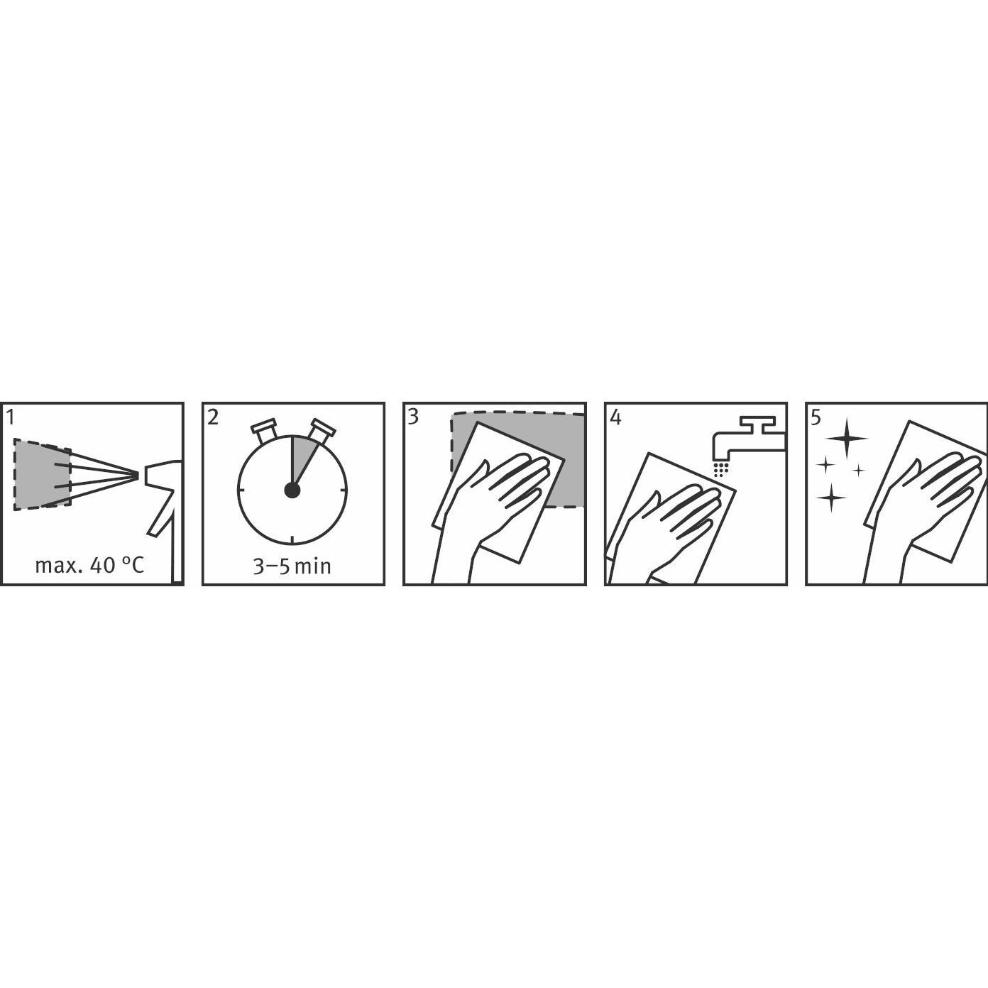 Instrucțiuni de utilizare: Pulverizați uniform și lăsați timp de 3–5 minute. Ștergeți cu buretele sau o cârpă moale, clătiți cu apă, repetați dacă este necesar, apoi lustruiți și uscați. Curățați suprafețele calde până la maximum 30–40 °C. Clătiți bine și ștergeți grăsimea și lichidul de curățare. Pentru oțel inoxidabil, pulverizați uniform pe toată suprafața sau aplicați cu o cârpă moale, apoi procedați ca mai sus. Recomandare: Utilizați o lavetă “eCloth” (cod articol 00312327) împreună cu acest produs. Formulă fără microplastice.