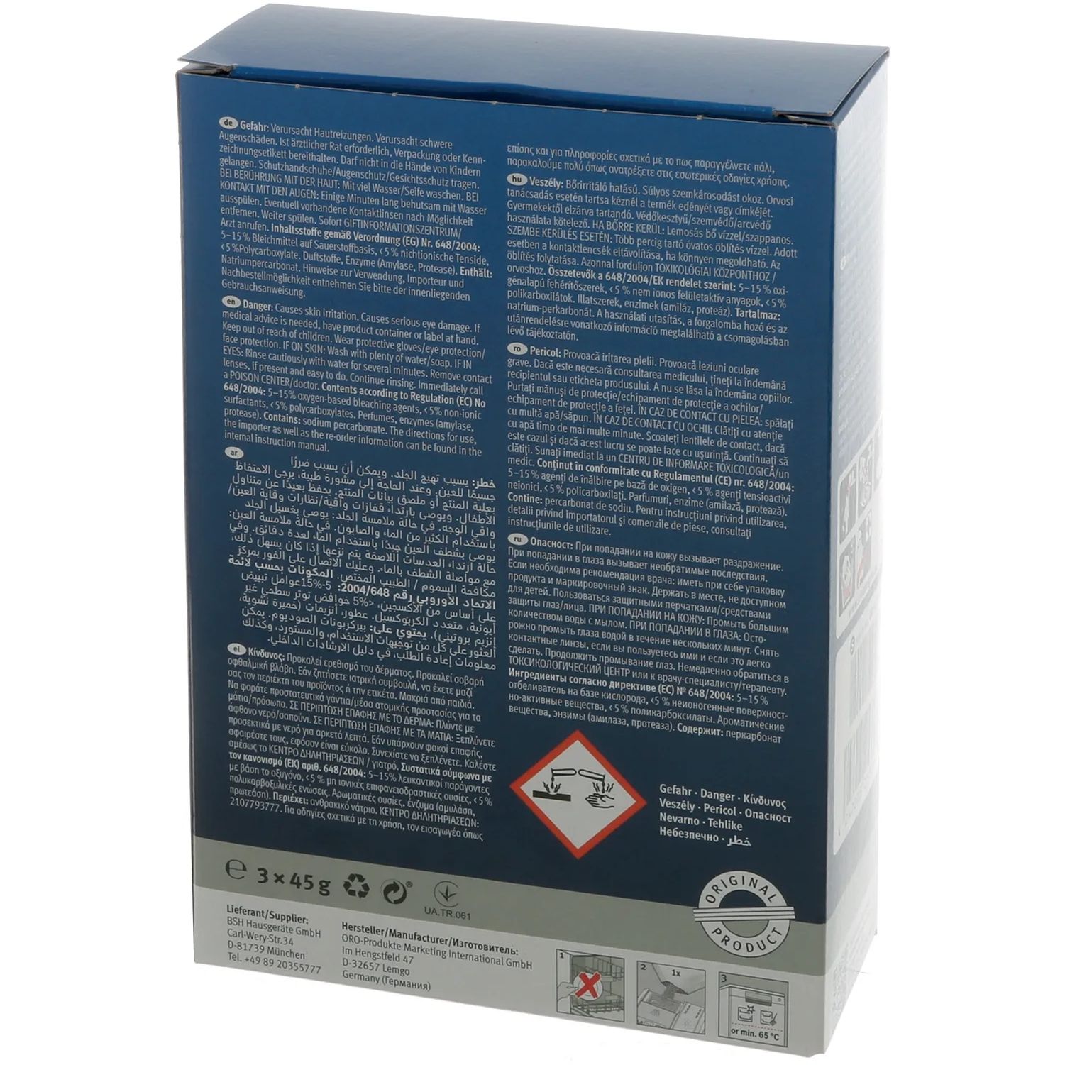 Conținut în conformitate cu Regulamentul (CE) nr. 648/2004: 5–15% agenți de înălbire pe bază de oxigen, < 5 % agenți tensioactivi neionici, < 5 % policarboxilați. Parfumuri, enzime (amilază, protează). Contine: percarbonat de sodiu. Formulă fără microplastice. Pentru mai multe informații, consultați documentele producătorului atașate mai jos.