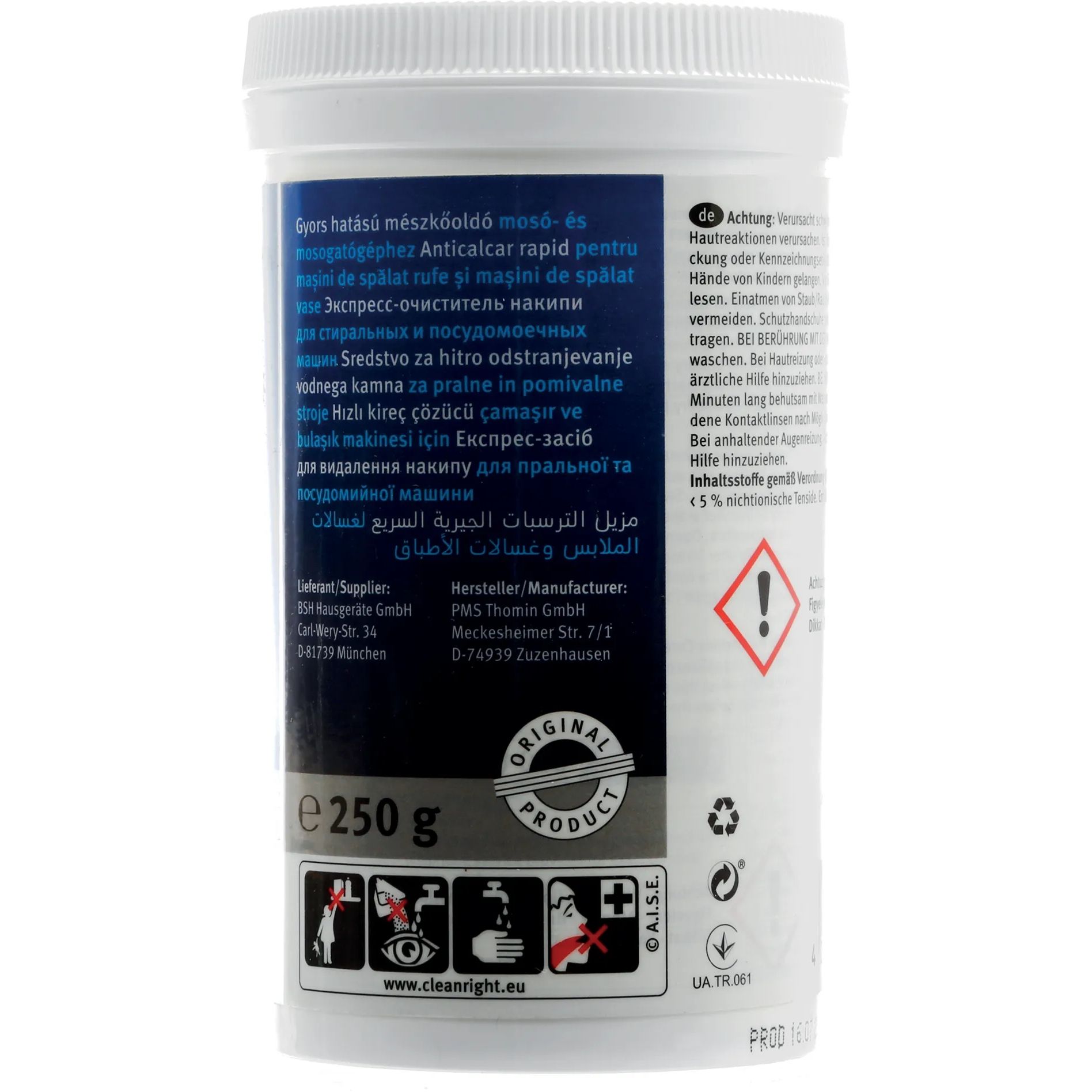 Instrucţiuni de utilizare pentru maşina de spălat vase: A nu se utiliza împreună cu detergenţii pentru maşina de spălat vase. Porniţi aparatul fără vase în interior la programul cu cea mai ridicată temperatură. După 30 de minute, deschideţi cu grijă maşina de spălat vase şi adăugaţi conţinutul pachetului. Apoi se derulează incă o dată programul pentru a clăti bine maşina. Excepţie: Dacă este disponibil un program de întreţinere a maşinii (consultaţi manualul de utilizare a aparatului), vă rugăm să selectaţi această setare şi să adăugaţi soluţia de decalcifiere înainte de începerea programului.