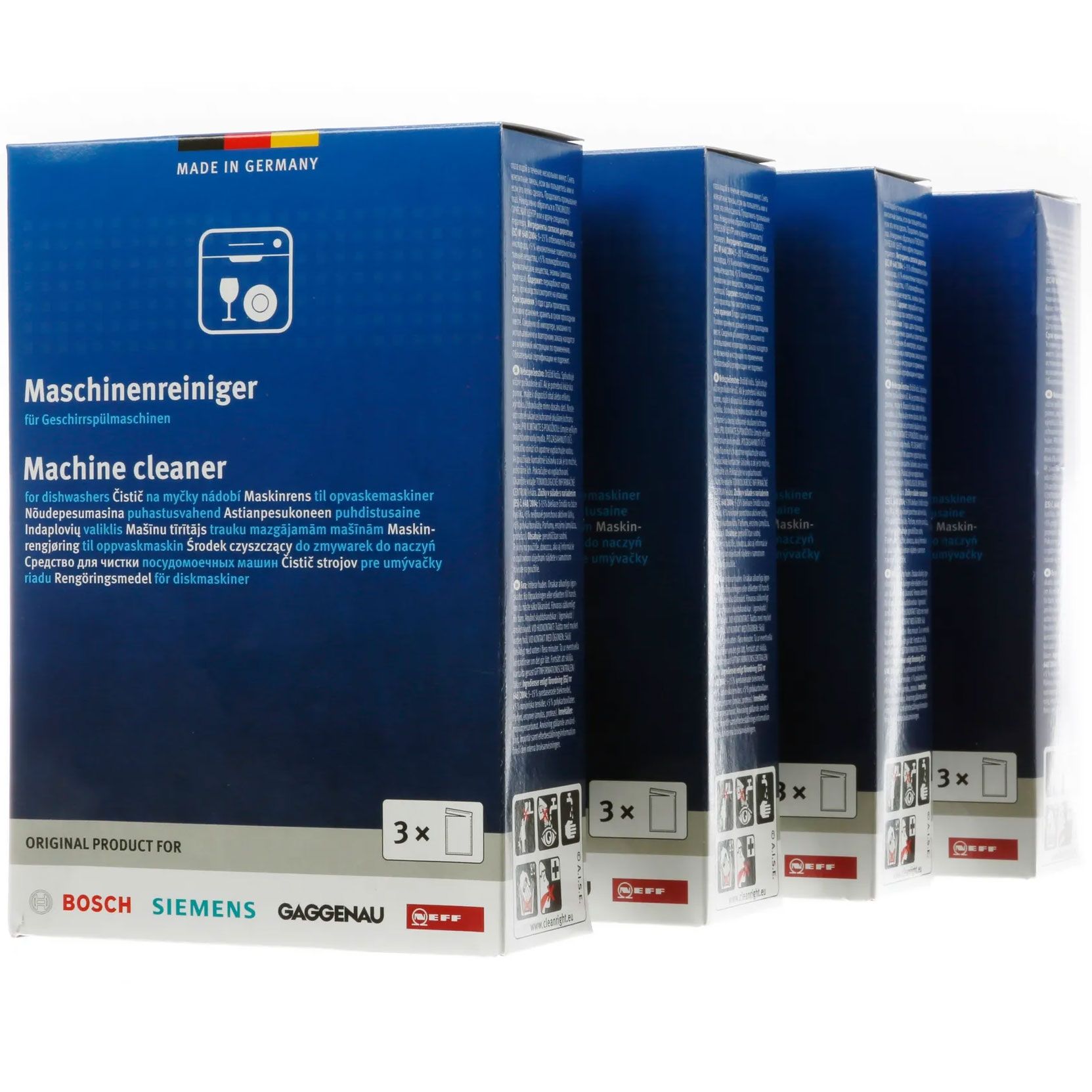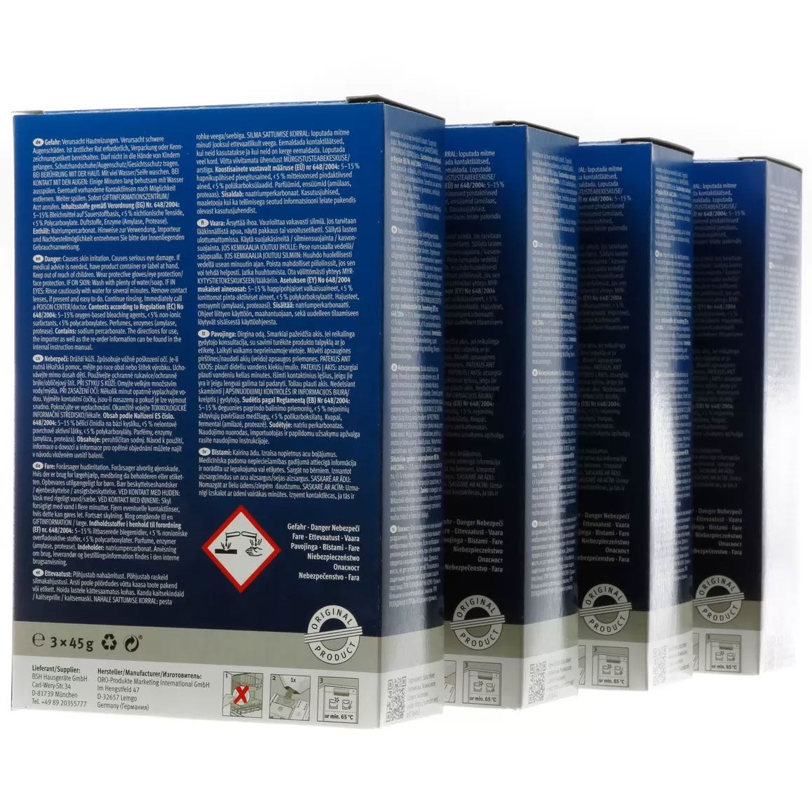 Set BOSCH 00312257, Conține 4 cutii a câte 3 plicuri de 45g, Pentru mașinile de spălat vase, Înlătură eficient grăsimea, amidonul și reziduurile de proteină, Curăță eficient furtunurile și pompa