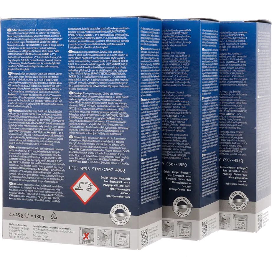 Pericol: Percarbonat de sodiu. Provoacă iritarea pielii. Provoacă leziuni oculare grave. Dacă este necesară consultarea medicului, țineți la îndemână recipientul sau eticheta produsului. A nu se lăsa la îndemâna copiilor. Purtați mănuși de protecție/echipament de protecție a ochilor/echipament de protecție a feței. ÎN CAZ DE CONTACT CU PIELEA: spălați cu multă apă/săpun. ÎN CAZ DE CONTACT CU OCHII: Clătiți cu atenție cu apă timp de mai multe minute. Scoateți lentilele de contact, dacă este cazul și dacă acest lucru se poate face cu ușurință. Continuați să clătiți. Sunați imediat la un CENTRU DE INFORMARE TOXICOLOGICĂ /un medic.