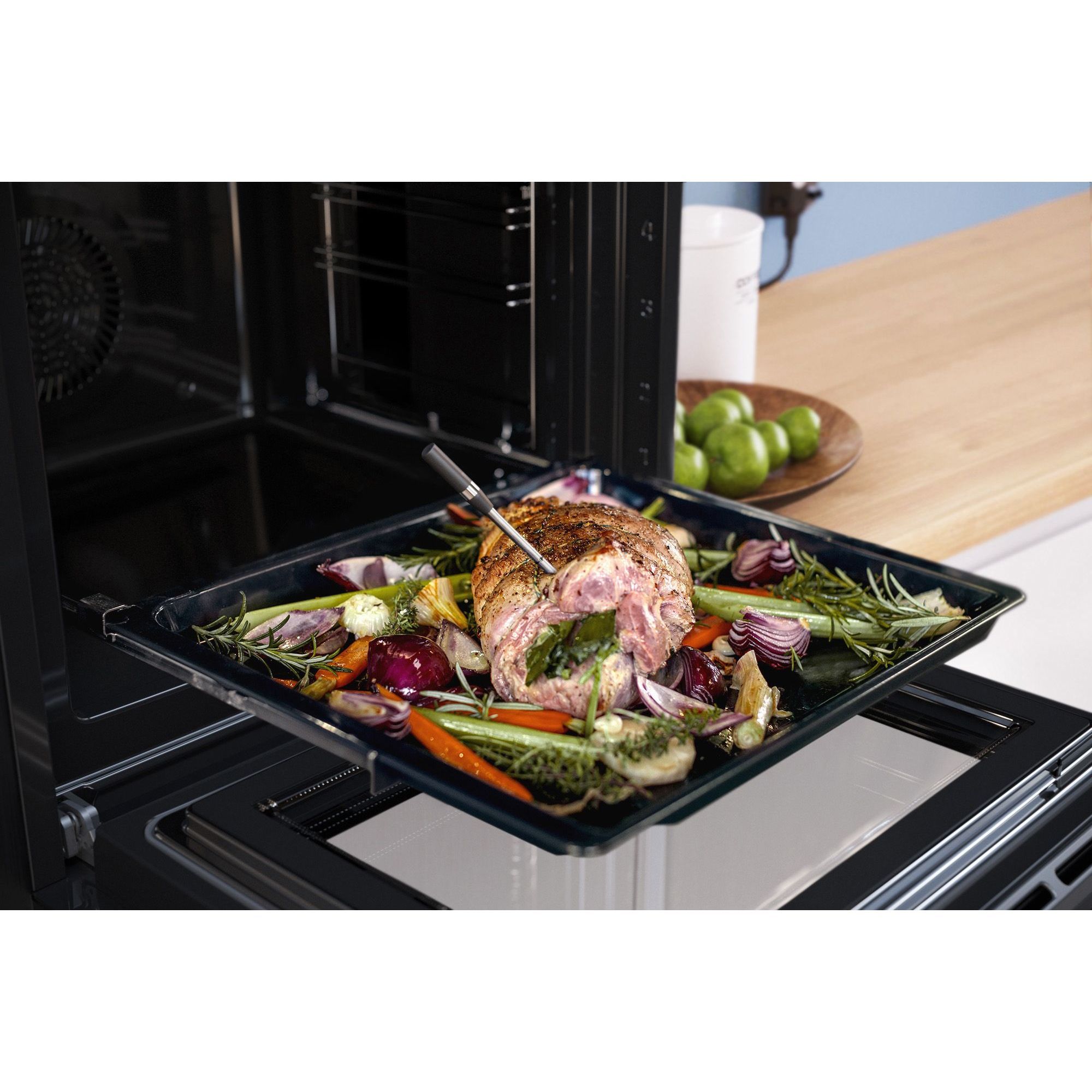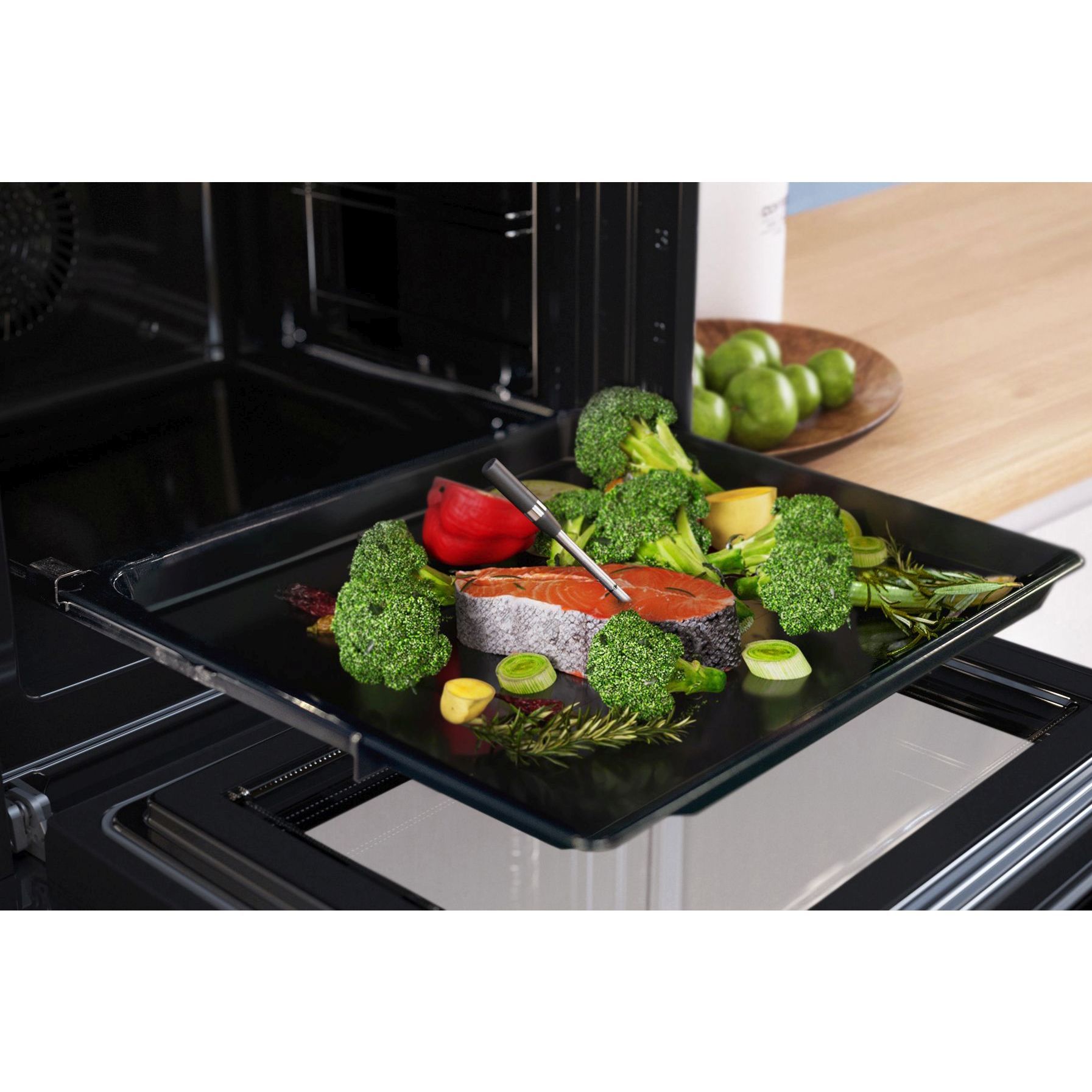 Termometrul wireless PerfectRoast pentru carne te ghidează de fiecare dată către rezultate de gătit ușoare și sănătoase. Patru senzori din interiorul acului extra subțire măsoară temperatura centrală a vasului. Se conectează la aplicația Home Connect prin Bluetooth și astfel poți monitoriza procesul de gătit de oriunde! Prin intermediul aplicației, vei primi o notificare când este atins nivelul dorit de preparare, iar cuptorul este oprit automat. Reține doar că trebuie să rămâi în raza de acțiune Bluetooth (până la 50 m linie vizuală) pentru informații despre procesul de gătit. În plus, oprirea cuptorului de la distanță este posibilă numai atunci când atât aplicația, cât și cuptorul sunt conectate la internet.