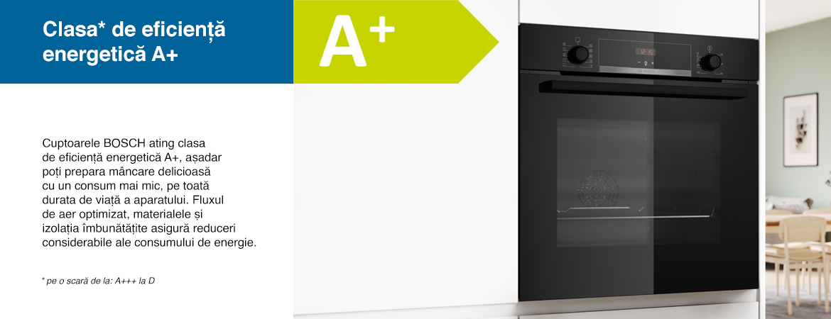• Clasa de eficiență energetică A+: datorită tehnologiei îmbunătățite a cuptorului, poți economisi energie în timp ce gătești