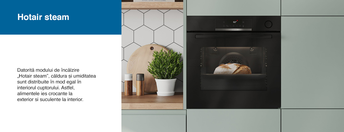 • Funcție abur suplimentar: prin adăugarea de abur la copt, preparatele devin crocante la exterior, dar rămân suculente în interior