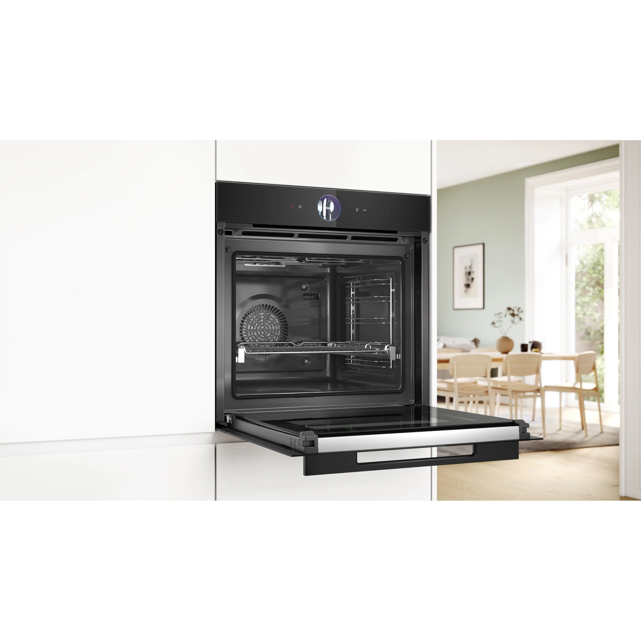 Cuptoarele Seria 8 din gama accent line sunt extrem de uşor de utilizat. Datorită finisajului lor complet negru, se potrivesc perfect cu orice mobilier de bucătărie, indiferent de stil. Iar inelul digital pentru comenzi este nu doar practic, ci şi conferă un plus de stil bucătăriei tale: acesta are un design minimalist atunci când este dezactivat şi se aprinde în culori calde atunci când este activat. De asemenea, navigarea în meniul cuptoarelor Seria 8 din gama accent line este extrem de simplă: poţi seta extrem de rapid şi uşor procesul de preparare şi temporizatorul direct pe afişajul tactil mare. Uşa cu geam fumuriu completează ingenios aspectul ultra-modern şi neted al cuptoarelor, iar tu poţi vedea în permanenţă preparatele din cuptor în timp ce acestea sunt gătite.