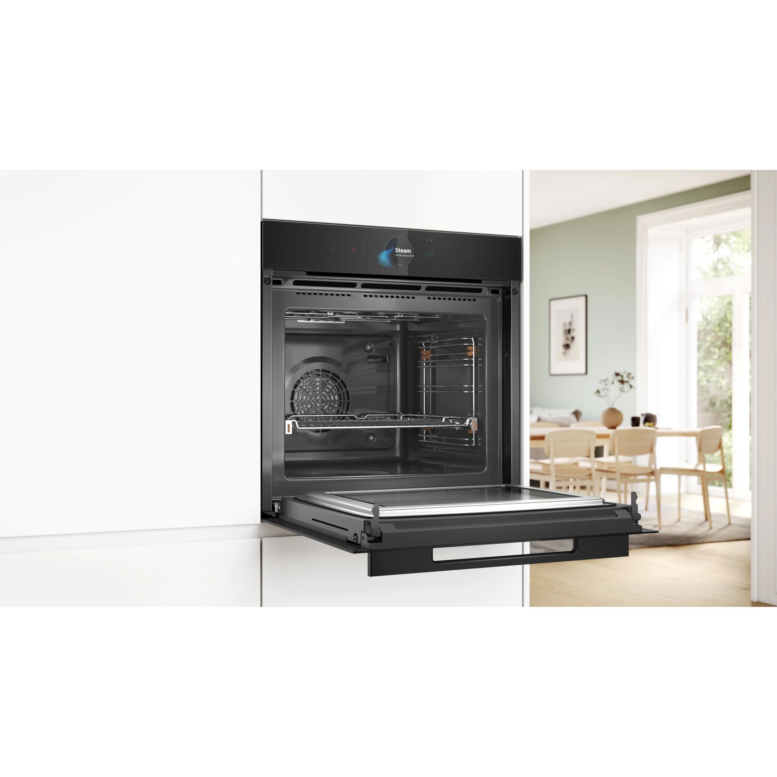 Cuptoarele Seria 8 din gama accent line sunt extrem de uşor de utilizat. Datorită finisajului lor complet negru, se potrivesc perfect cu orice mobilier de bucătărie, indiferent de stil. Iar inelul digital pentru comenzi este nu doar practic, ci şi conferă un plus de stil bucătăriei tale: acesta are un design minimalist atunci când este dezactivat şi se aprinde în culori calde atunci când este activat. De asemenea, navigarea în meniul cuptoarelor Seria 8 din gama accent line este extrem de simplă: poţi seta extrem de rapid şi uşor procesul de preparare şi temporizatorul direct pe afişajul tactil mare. Uşa cu geam fumuriu completează ingenios aspectul ultra-modern şi neted al cuptoarelor, iar tu poţi vedea în permanenţă preparatele din cuptor în timp ce acestea sunt gătite.