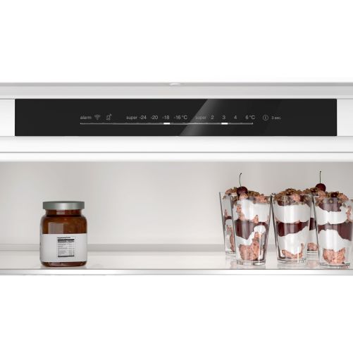 Cu funcția Super Cooling, poți reduce temporar temperatura din frigider înainte de a merge la cumpărături. Astfel, alimentele proaspăt achiziționate sunt păstrate la temperatura optimă. Este suficient să apeși un buton pentru a scădea temperatura cu până la 2°C. Iar pentru a evita consumul inutil de energie, funcția revine automat la setările normale după aproximativ 6-15 ore. În plus, dacă frigiderul tău este conectat, poți activa funcția Super Cooling direct din aplicația Home Connect.