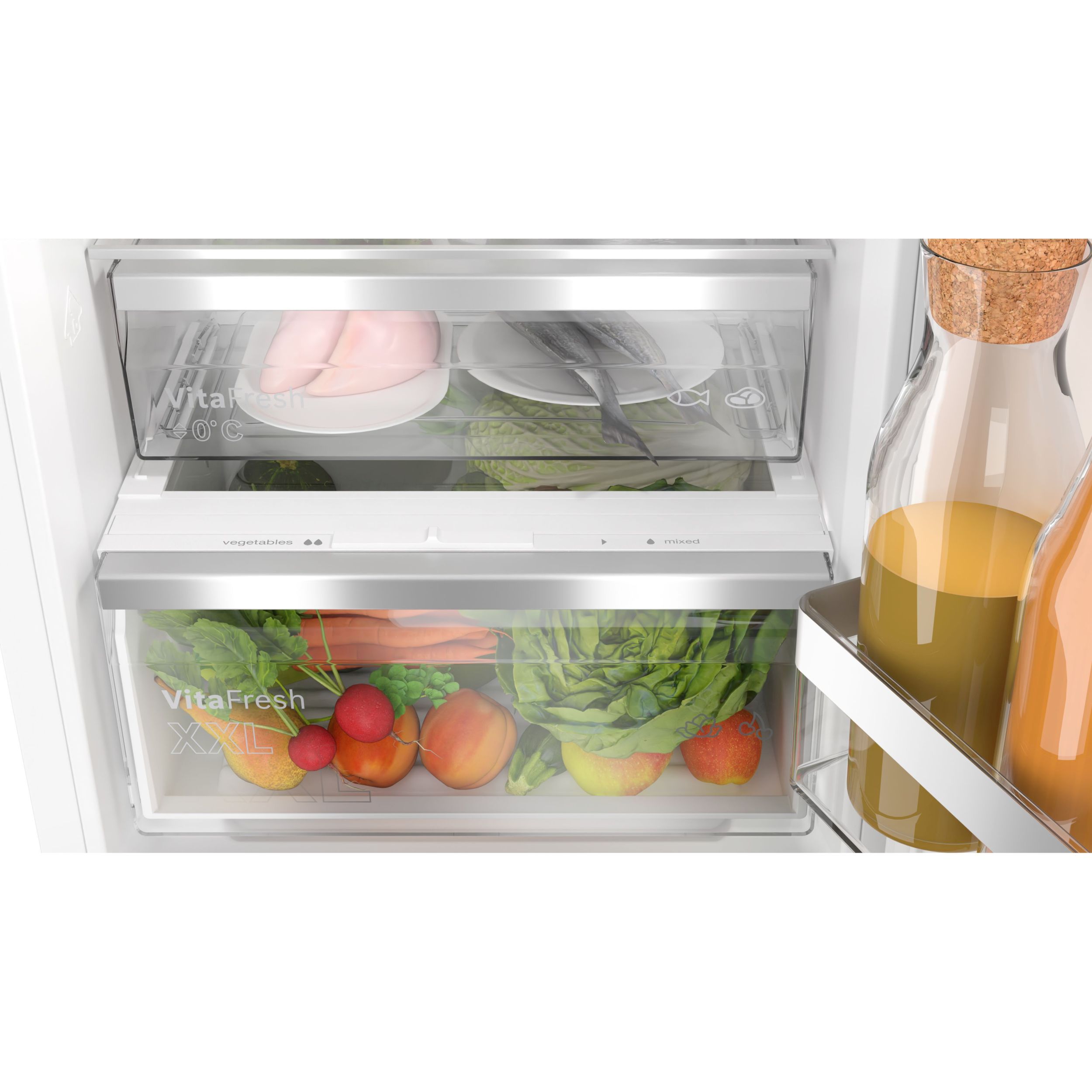 Combina frigorifică încorporabilă No Frost cu VitaFresh XXL <0°> și nivel constant de temperatură păstrează alimentele proaspete pentru mai mult timp. Toate produsele dumneavoastră sunt congelate fără gheață și vizibile datorită iluminării suplimentare a congelatorului.