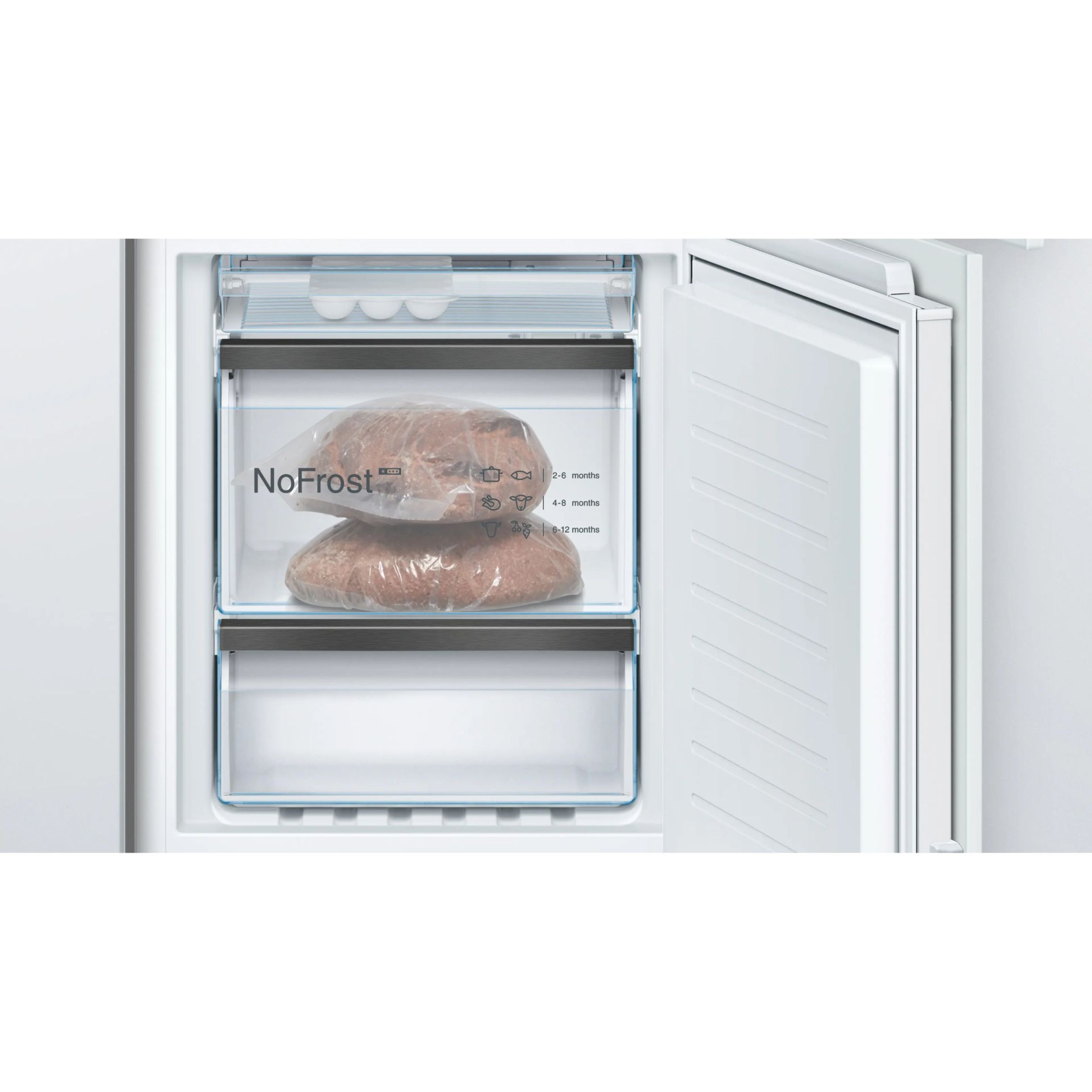 Circulația uniformă a aerului rece uscat în interiorul congelatorului previne formarea gheții. Ca urmare, nu se acumulează gheață nici pe peretele din spate, nici pe sertarele congelatorului. Astfel, No Frost oferă confort maxim, deoarece nu trebuie să mai dezgheți niciodată congelatorul.