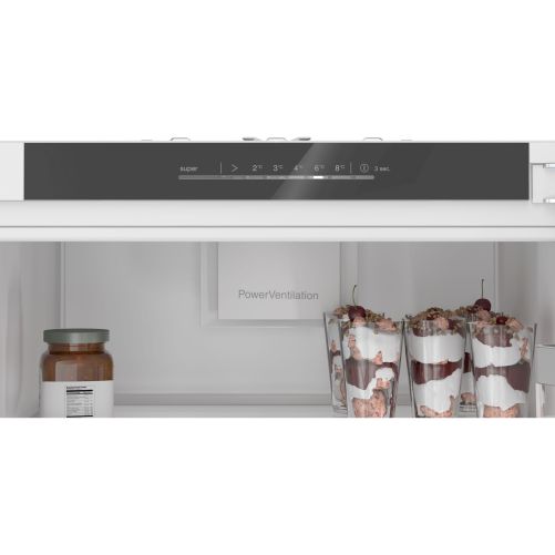 Cu funcția Super Cooling, poți reduce temporar temperatura din frigider înainte de a merge la cumpărături. Astfel, alimentele proaspăt achiziționate sunt păstrate la temperatura optimă. Este suficient să apeși un buton pentru a scădea temperatura cu până la 2°C. Iar pentru a evita consumul inutil de energie, funcția revine automat la setările normale după aproximativ 6-15 ore. În plus, dacă frigiderul tău este conectat, poți activa funcția Super Cooling direct din aplicația Home Connect.