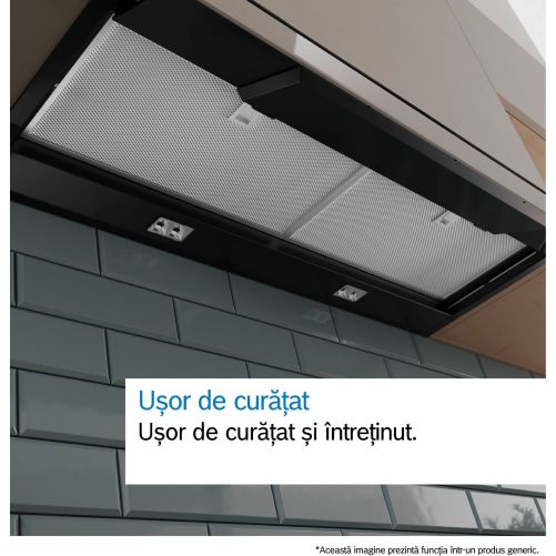 Filtrele metalice pentru grăsime asigură îndepărtarea eficientă a grăsimii și a particulelor solide din aerul extras. Pentru eficiență maximă, curăță aceste filtre regulat, fie manual, fie în mașina de spălat vase. Funcția de monitorizare a gradului de saturare a filtrului din aplicație* te avertizează când este momentul să le cureți. Menține performanța optimă a hotei și păstrează prospețimea în bucătărie cu ușurință.