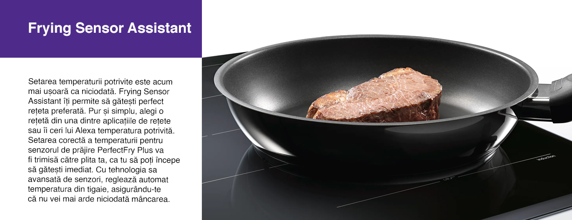 Setarea temperaturii potrivite este acum mai ușoară ca niciodată. Frying Sensor Assistant îți permite să gătești perfect rețeta preferată. Pur și simplu, alegi o rețetă din una dintre aplicațiile de rețete sau îi ceri lui Alexa temperatura potrivită. Setarea corectă a temperaturii pentru senzorul de prăjire PerfectFry Plus va fi trimisă către plita ta, ca tu să poți începe să gătești imediat. Cu tehnologia sa avansată de senzori, reglează automat temperatura din tigaie, asigurându-te că nu vei mai arde niciodată mâncarea.