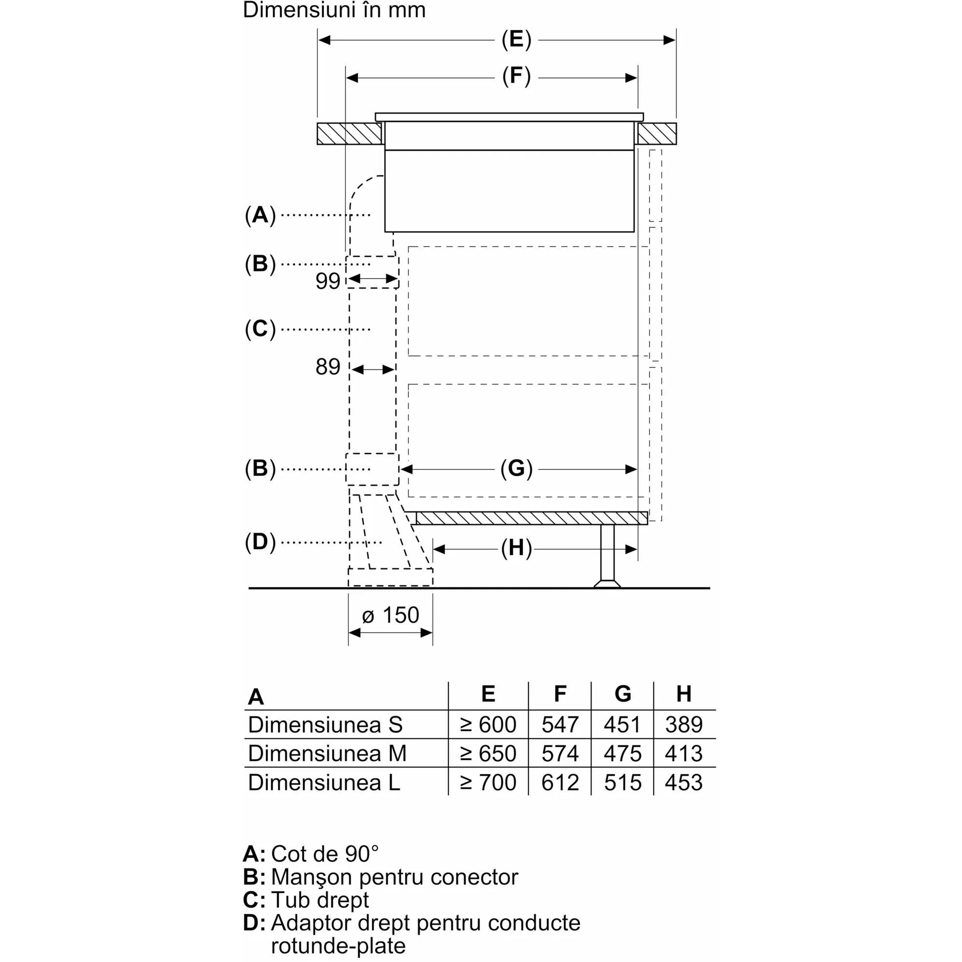 - - Pentru instalarea în regim recirculare cu tubulatură parțială sau fără tubulatură, trebuie să se respecte o deschidere de retur de ≥400cm² în zona plintei. Deschiderea poate fi realizată prin intermediul grilelor de evacuare, grilelor cu lamele sau a plintelor decupate subtil, în funcție de tipul mobilierului de bucătărie.