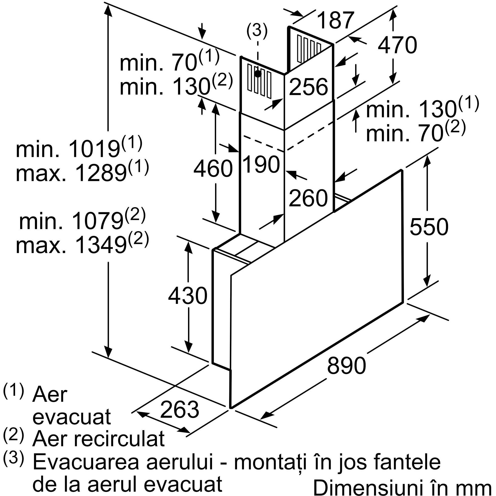 Dimensiuni hotă pentru montaj în mod recirculare (ÎxLxA): 1079-1349 x 890 x 263mm