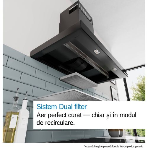 Bucură-te de aer proaspăt în timp ce gătești - chiar și în modul de recirculare. Sistemul avansat cu două filtre elimină eficient grăsimea și mirosurile. Filtrul metalic reține grăsimea grosieră, iar filtrul cu carbon activ se ocupă de particulele fine și de mirosuri. Filtrul BOSCH Long-life Clean Air (accesoriu nr. DWZ1FB1B6) elimină grăsimea și mirosurile - chiar și pe cele puternice, precum peștele prăjit. Poate fi reîmprospătat de trei ori și are o durată de viață de până la patru ani. - economisind bani și menținând bucătăria proaspătă.