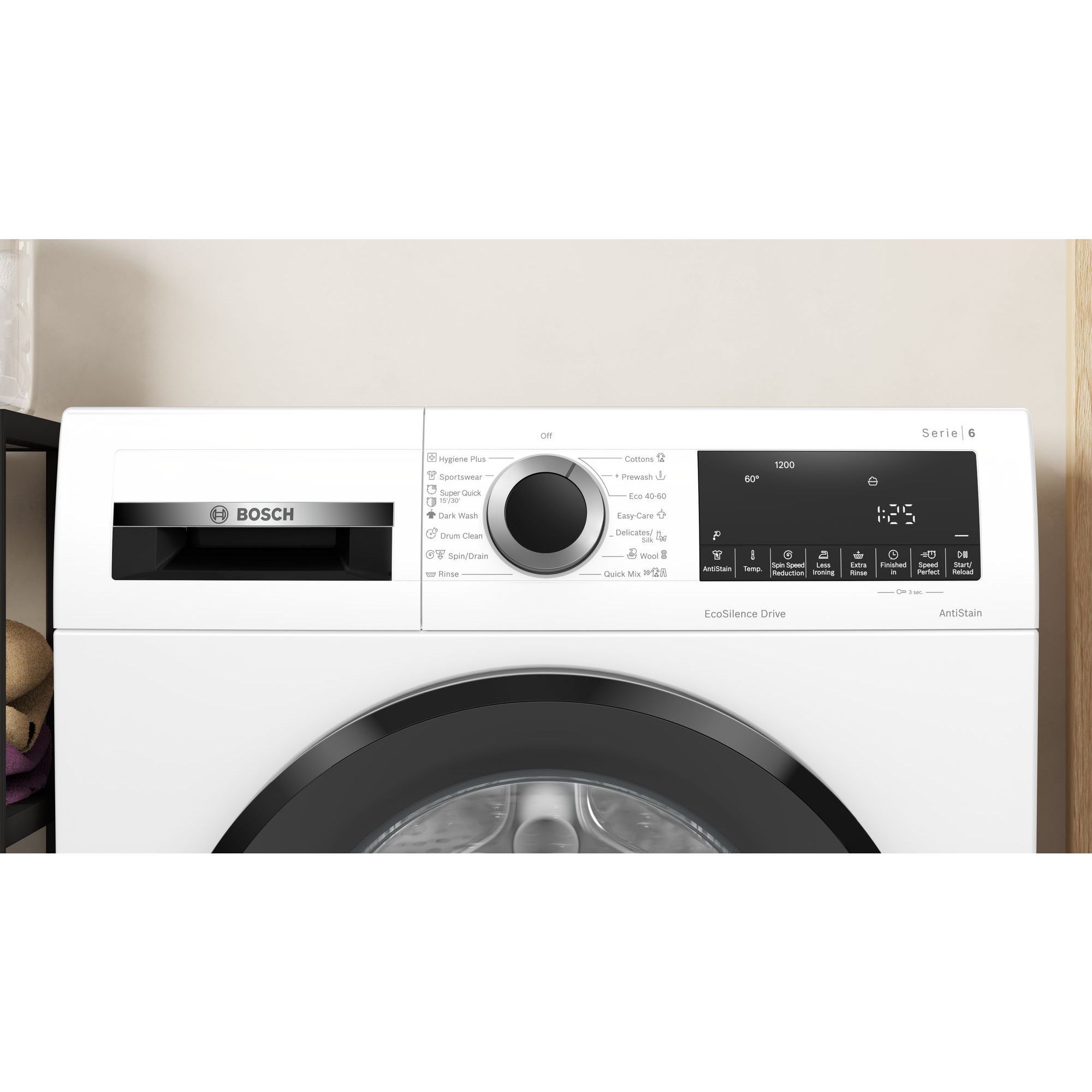 - Programe speciale: HygienePlus, DrumClean (cu reminder), Culori închise, Evacuare/Centrifugare, Rapid/Mix, Sport, Clătire, Super rapid 30'/15'