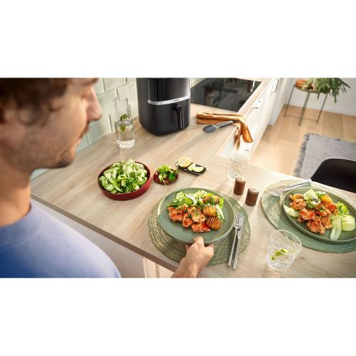 Experimentează magia elementelor de încălzire dube în friteuza noastră cu aer. Căldura vine atât de sus, cât și de jos, asigurând rumenirea uniformă a alimentelor. Obține un rezultat delicios, auriu, pe preparatele tale preferate, reducând la minim necesitatea de a întoarce mâncarea în timpul gătitului.