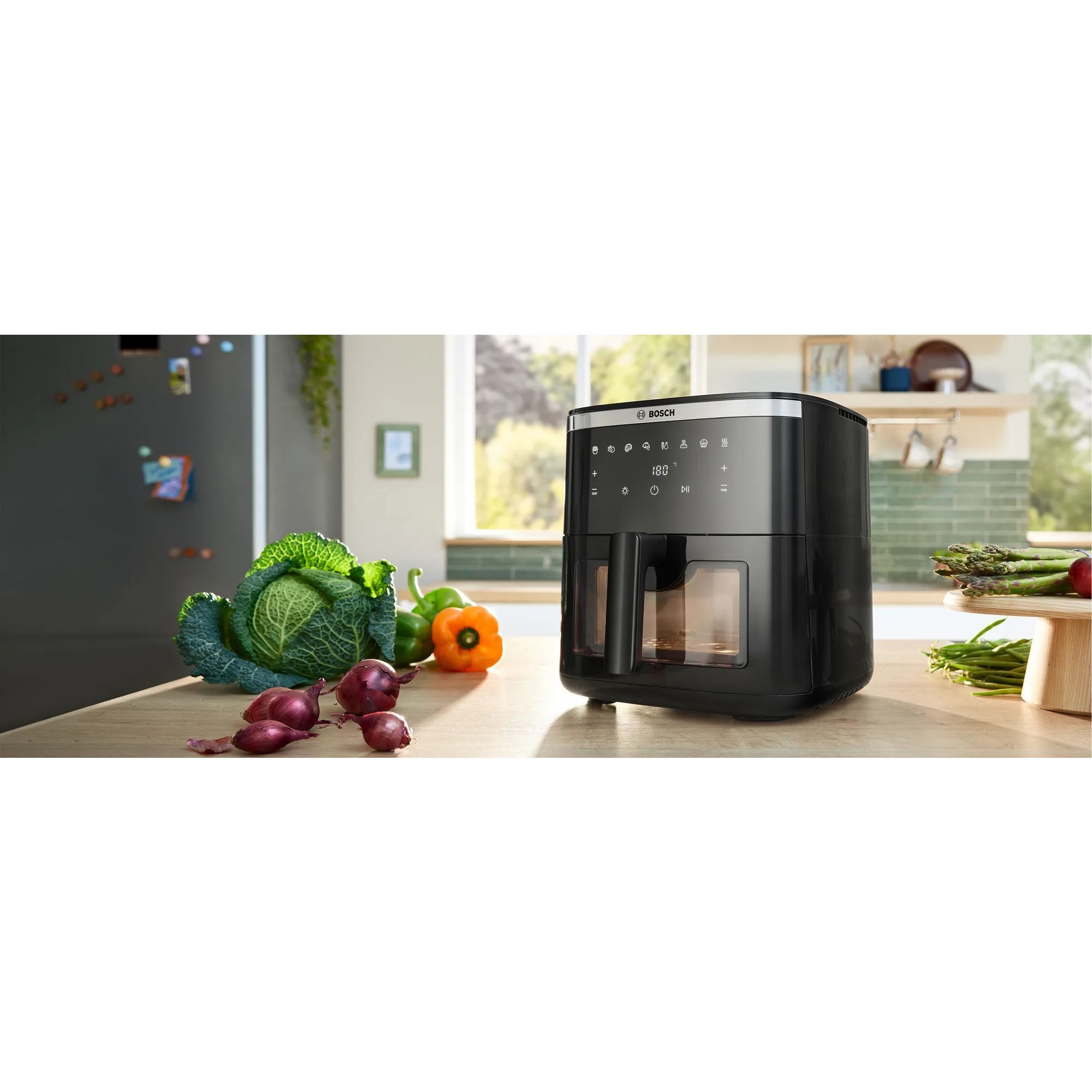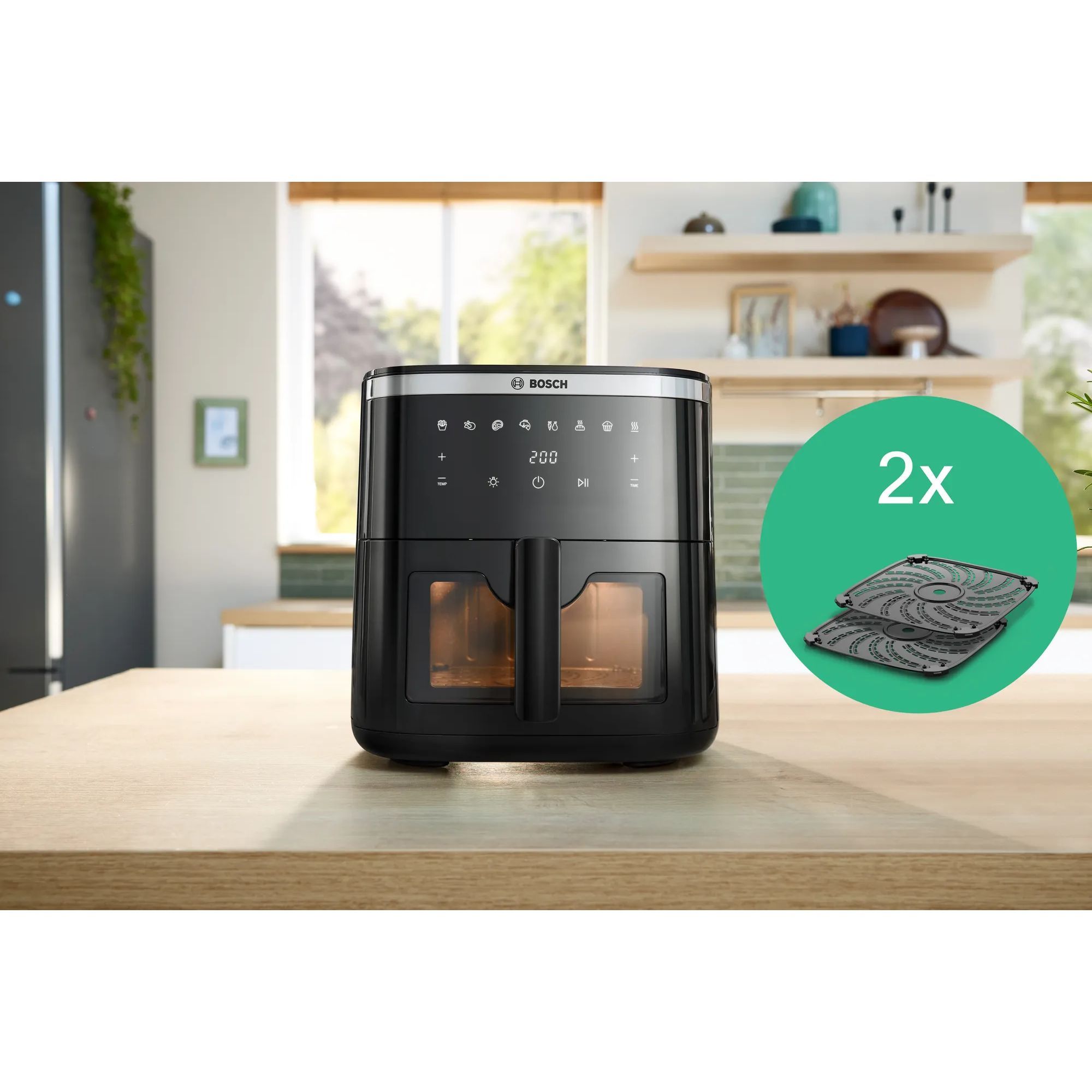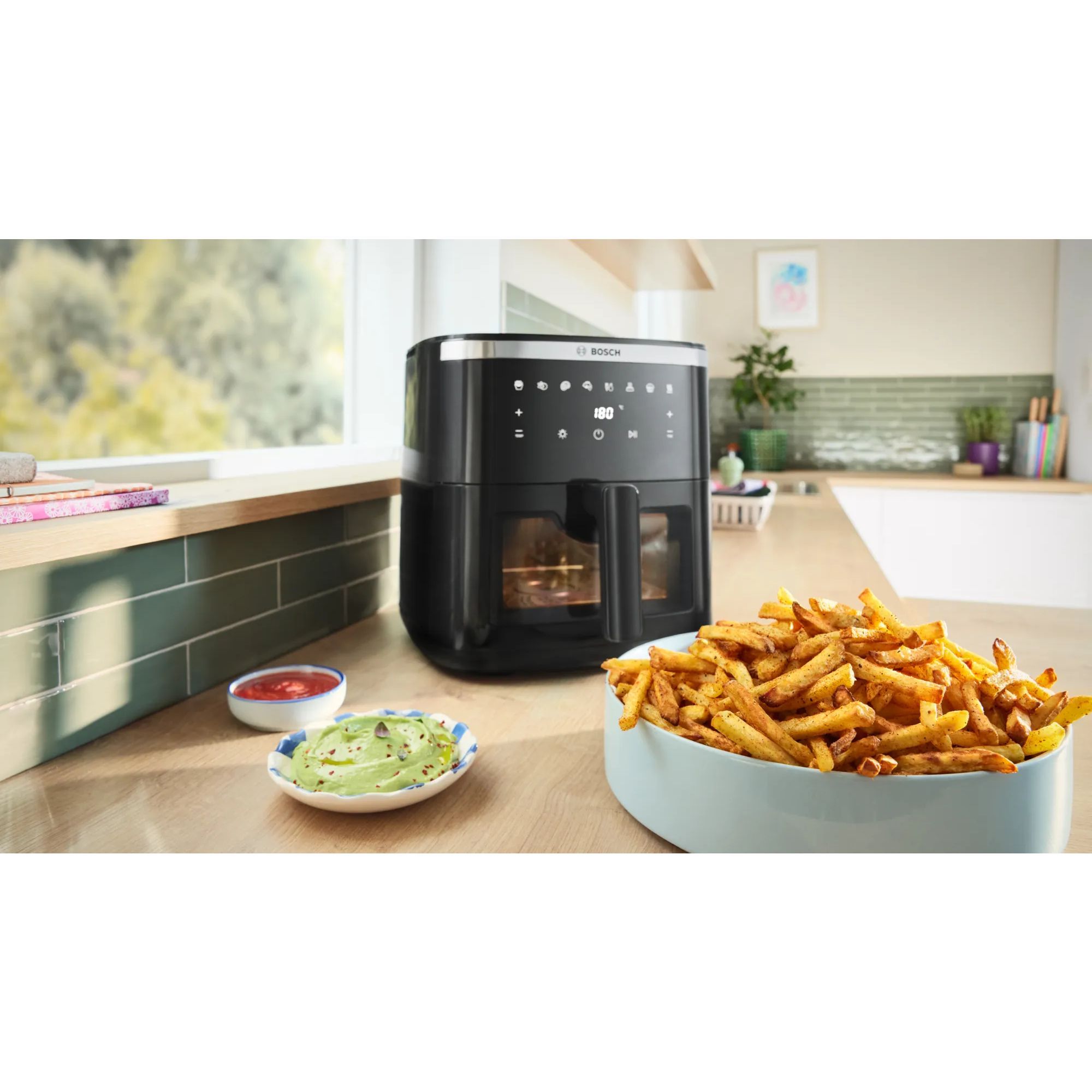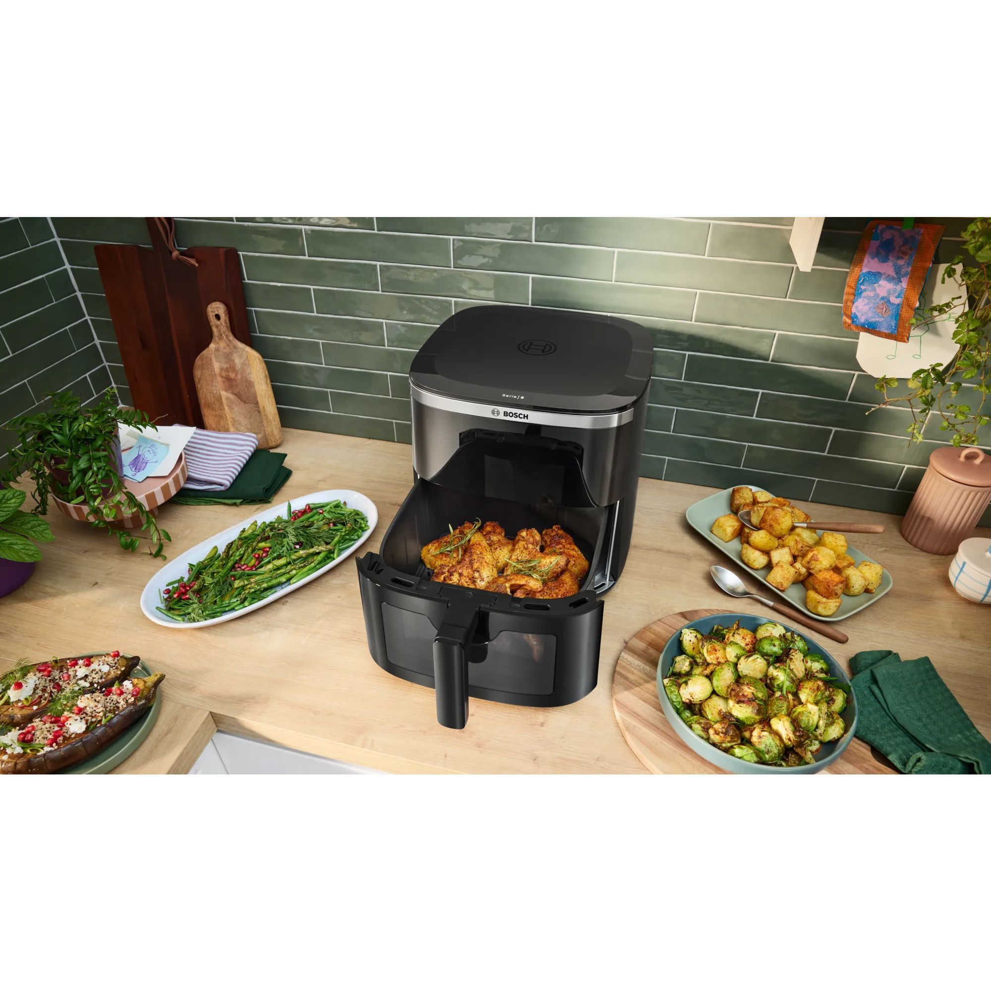 Gătește sănătos cu friteuza cu aer de la Bosch, deoarece necesită fie deloc, fie foarte puțin ulei datorită circulației rapide a aerului.