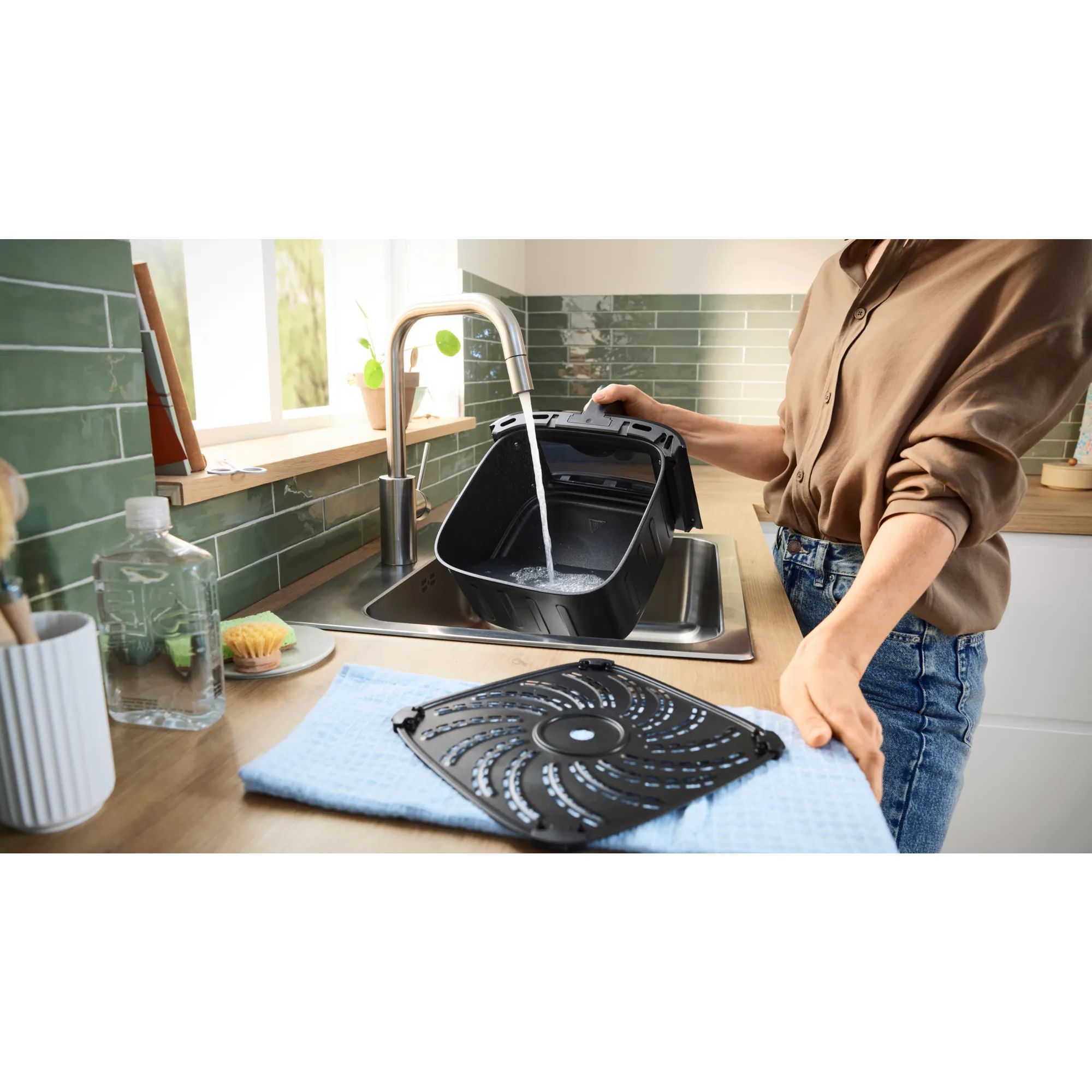 Curățare ușoară datorită dimensiunii compacte a coșului și grilei interioare detașabile, care permit curățarea ușoară sub jet de apă. De asemenea, pot fi spălate în mașina de spălat vase.