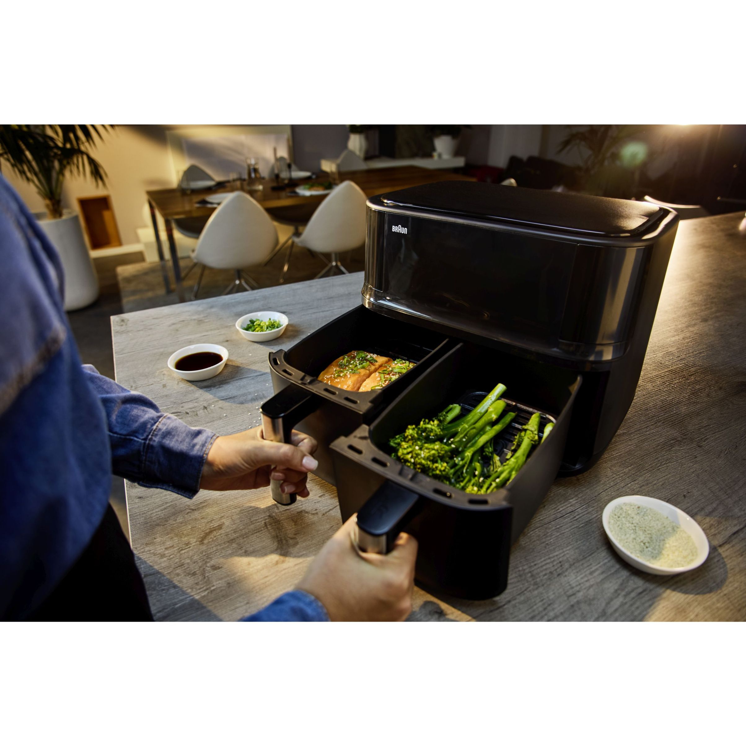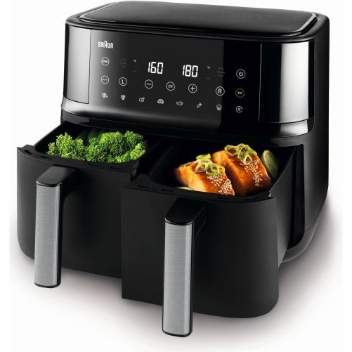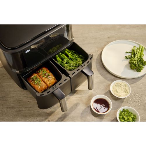 Bucură-te de o masă completă - noul TwinCook 3 de la BRAUN îți permite să gătești două preparate diferite simultan, creând o masă completă cu 50% mai rapidă*. Spune adio grijilor legate de sincronizare: o apăsare a butonului Sincronizare și ambele preparate sunt gata în același timp. Un mod sănătos de a găti, folosind cu până la 90% mai puțină grăsime*, fără a sacrifica aroma sau textura. Iar sertarele care pot fi spălate în mașina de spălat vase fac curățarea ușoară.