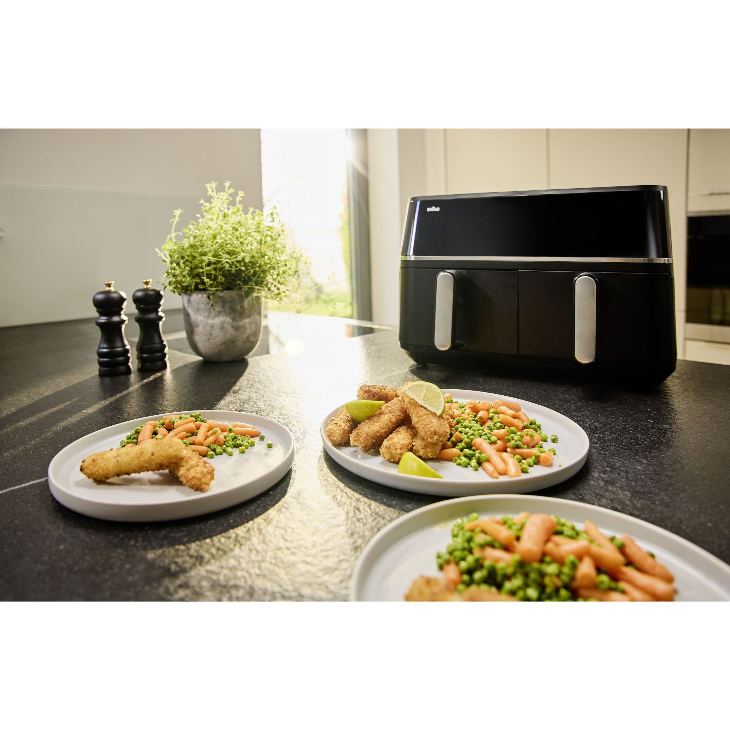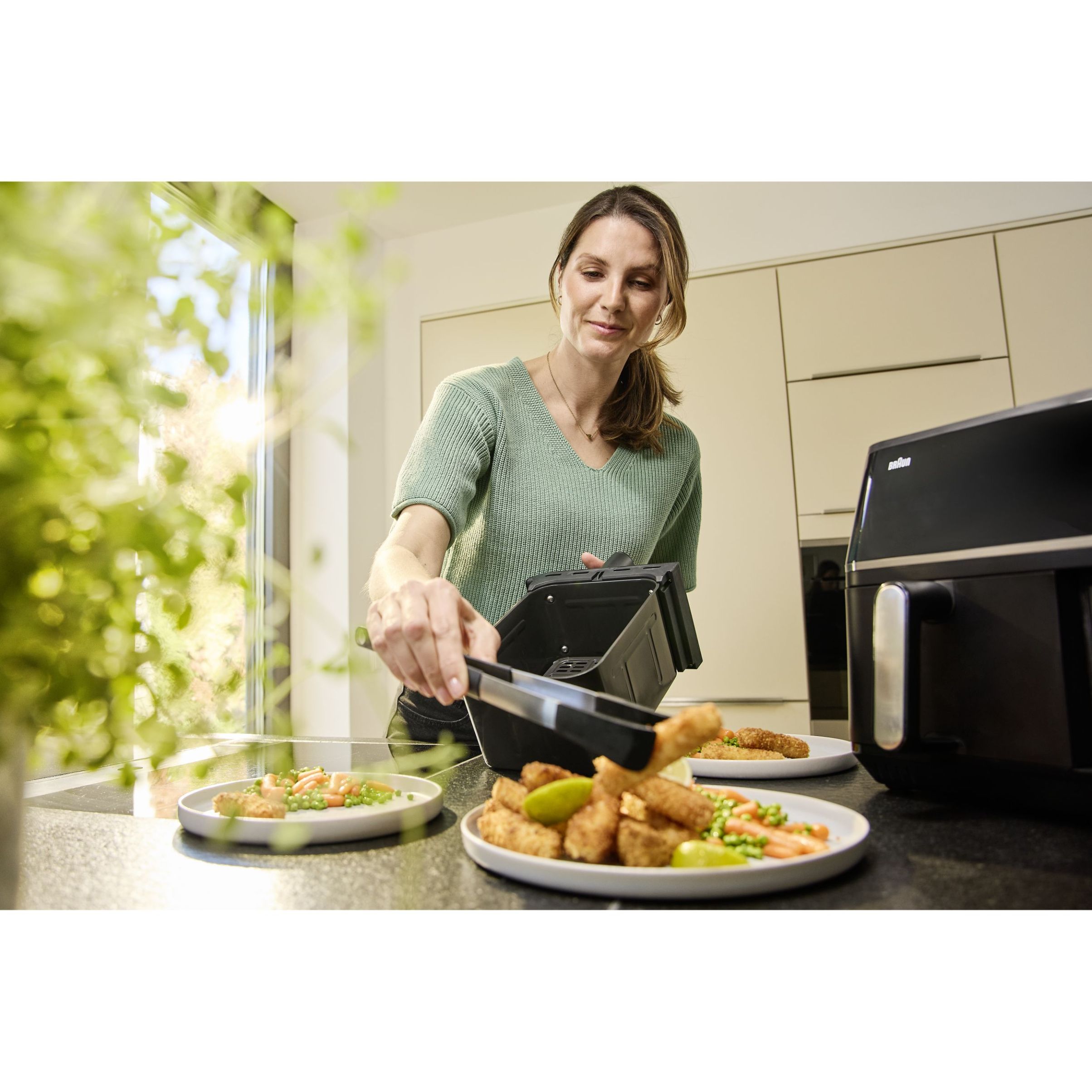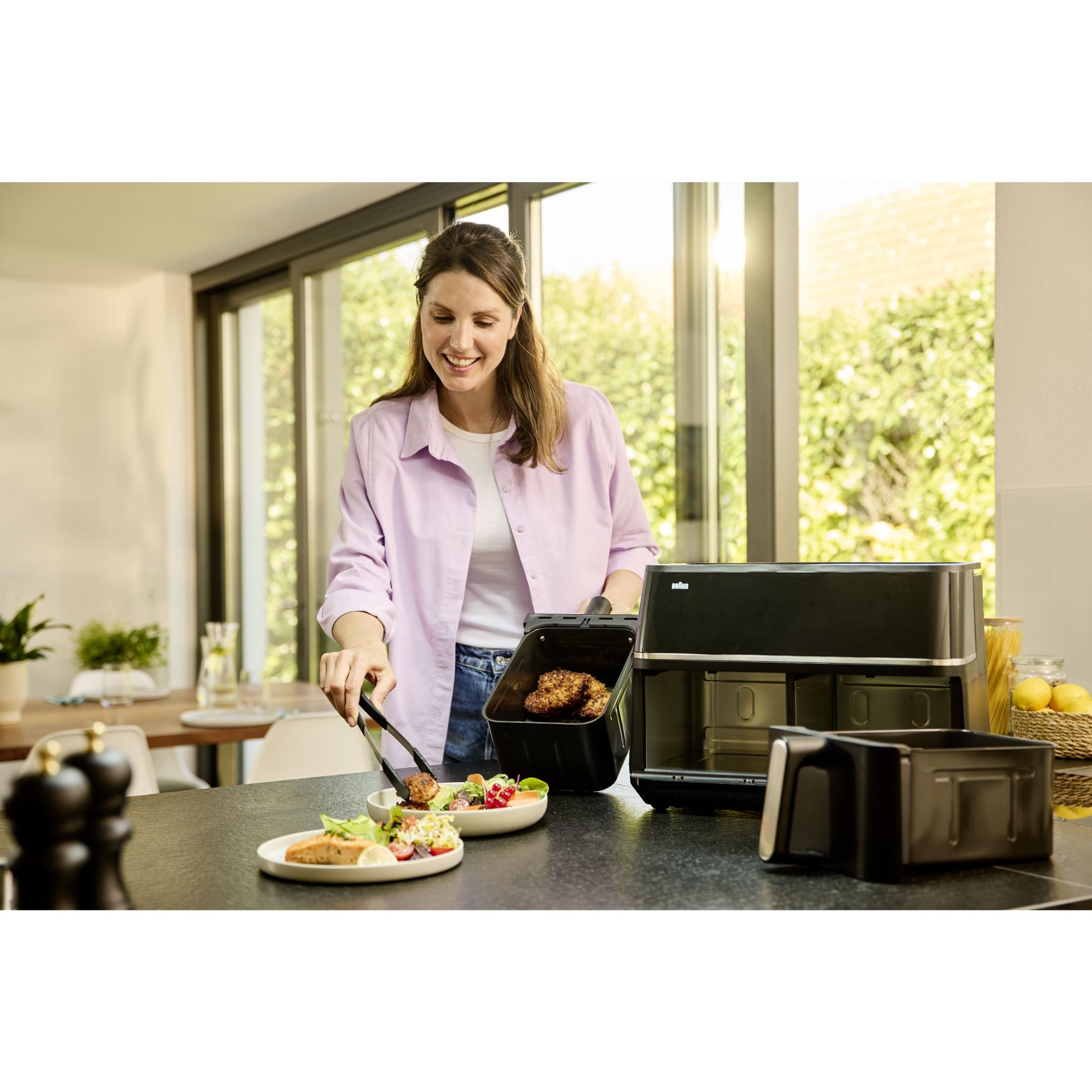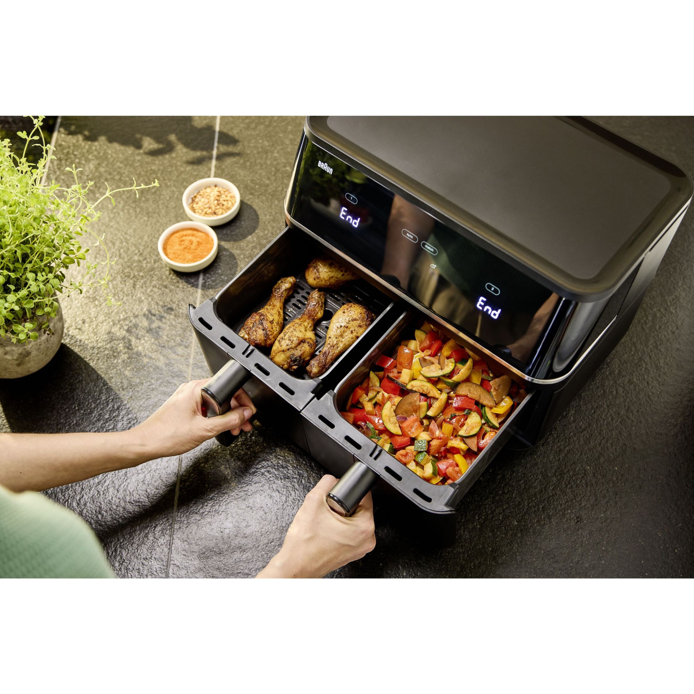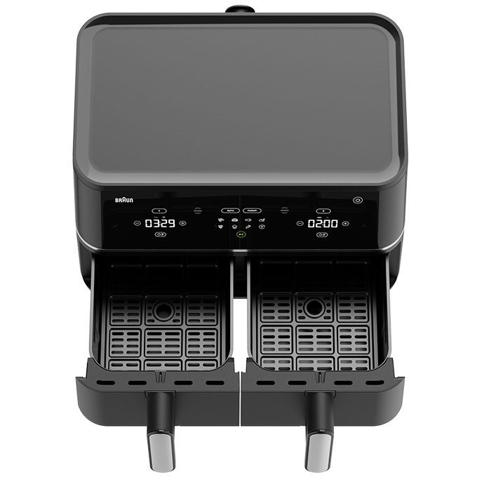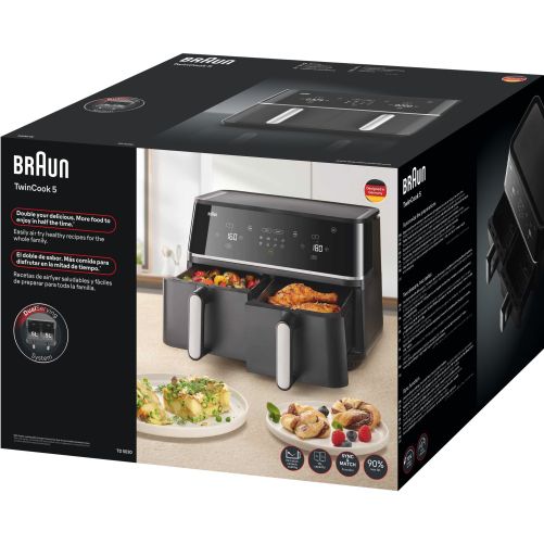 Prepararea unei cantități mari din produsele preferate ale familiei tale a devenit mai rapidă și mai ușoară. Cele două sertare foarte mari de 5 litri ale aparatului BRAUN TwinCook 5 te ajută să pregătești cu ușurință o masă completă. Prăjește un pui întreg de 1,4kg cu legume, ambele în același timp: funcția Sync simplifică acest lucru! Funcția Match permite duplicarea setărilor pentru ambele sertare, astfel încât să poți prepara 2,4kg de cartofi prăjiți. Și, datorită tehnologiei RealAir, vei obține gustul delicios pe care îl adori, cu 50% mai rapid*, utilizând o cantitate foarte mică de ulei și cu până la 90% mai puțină grăsime**.