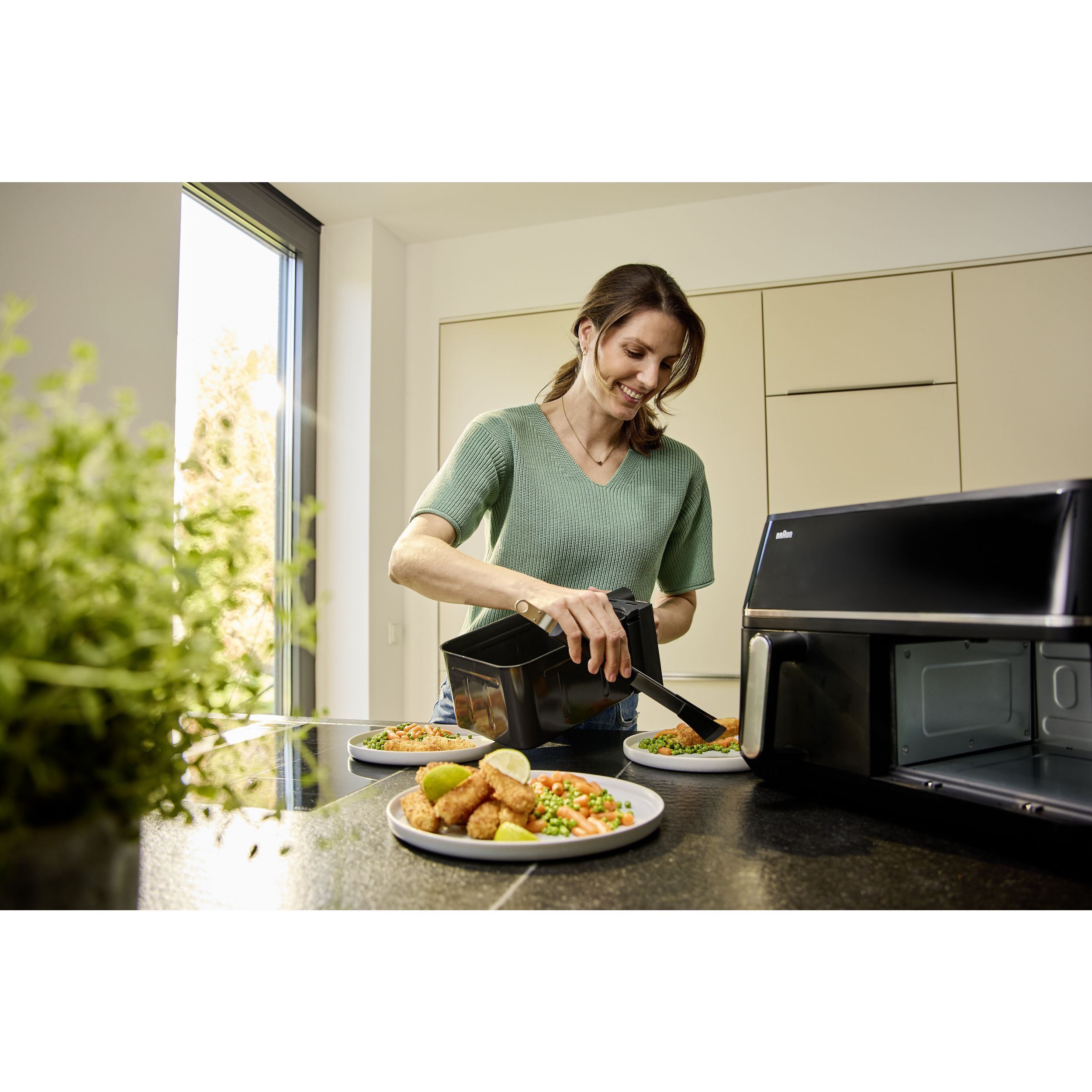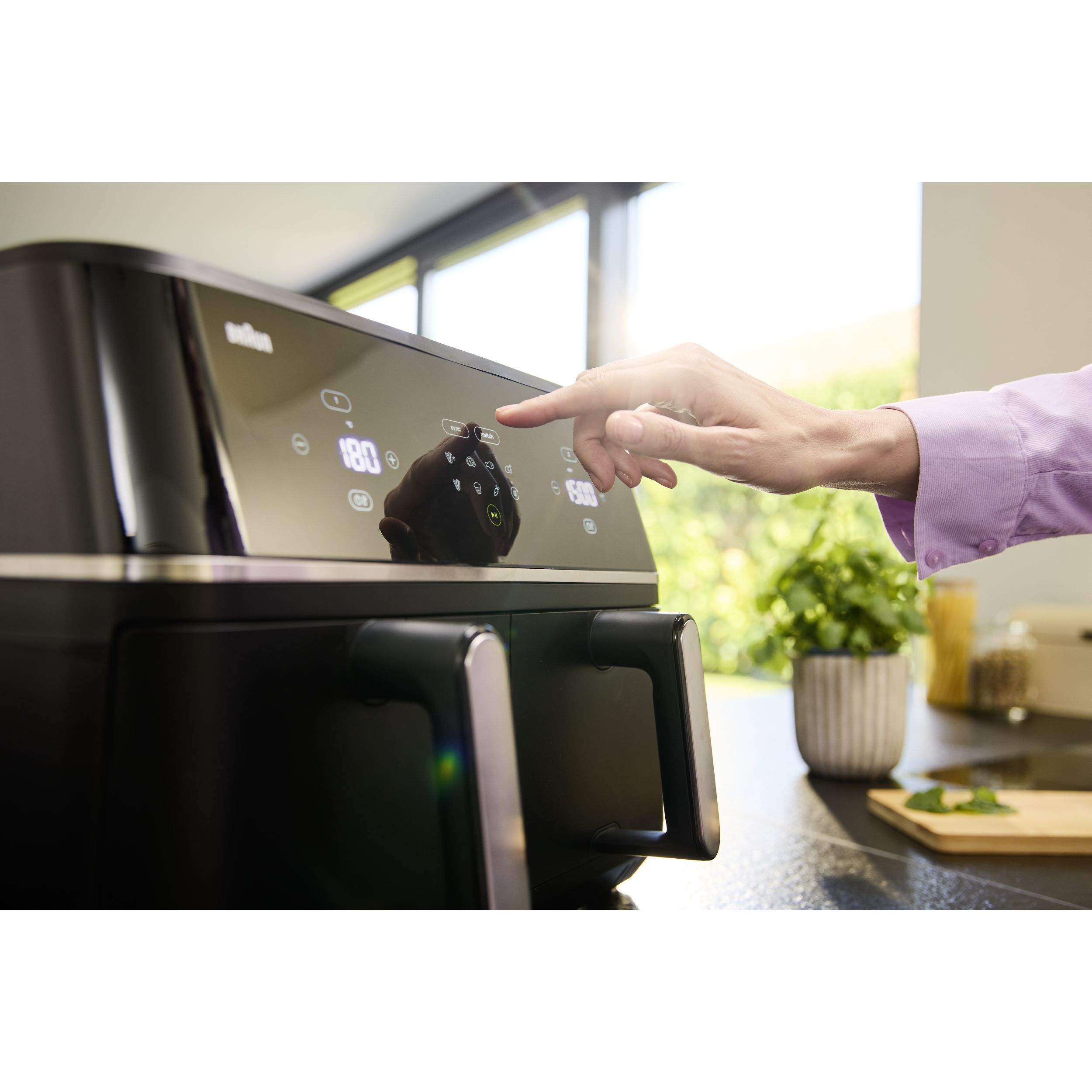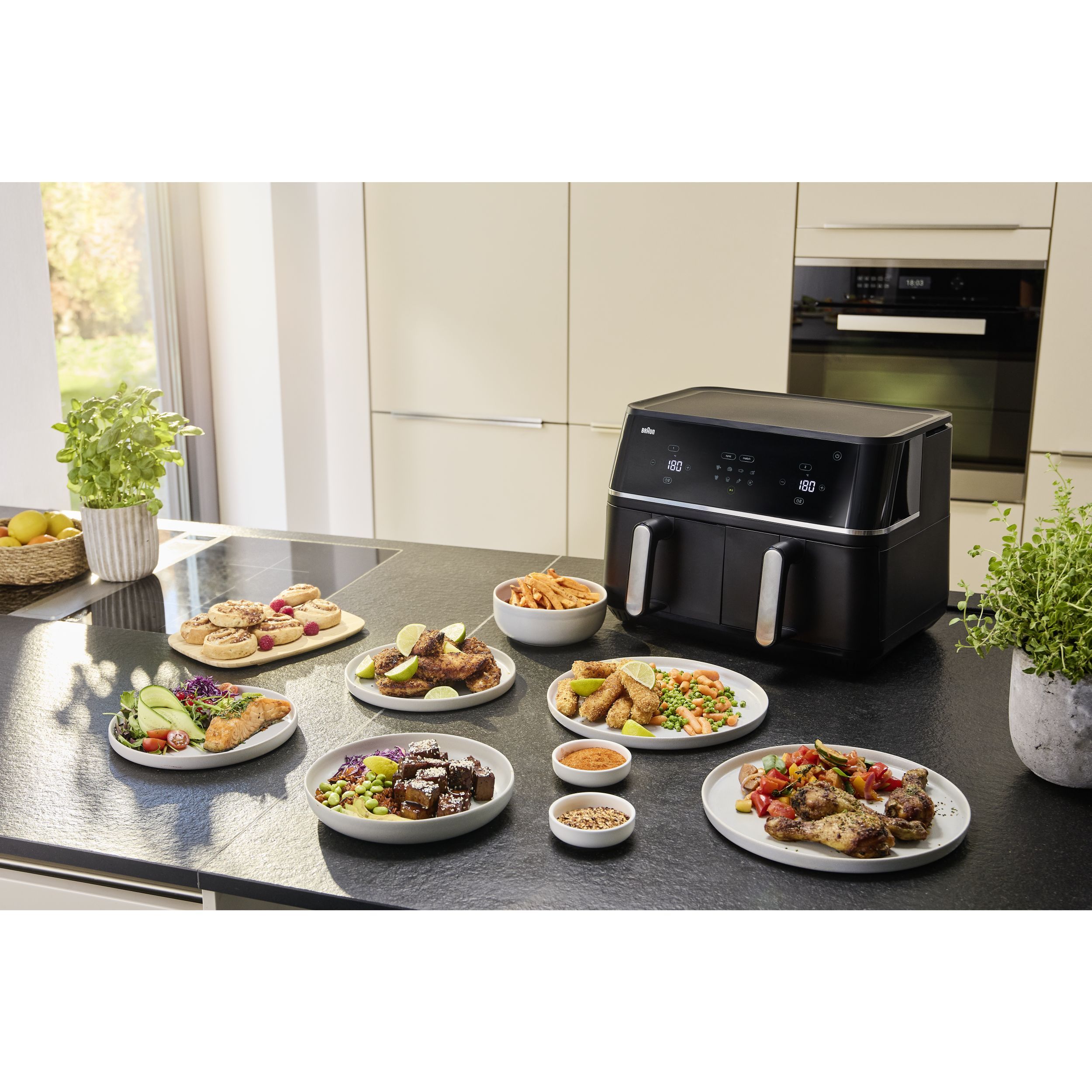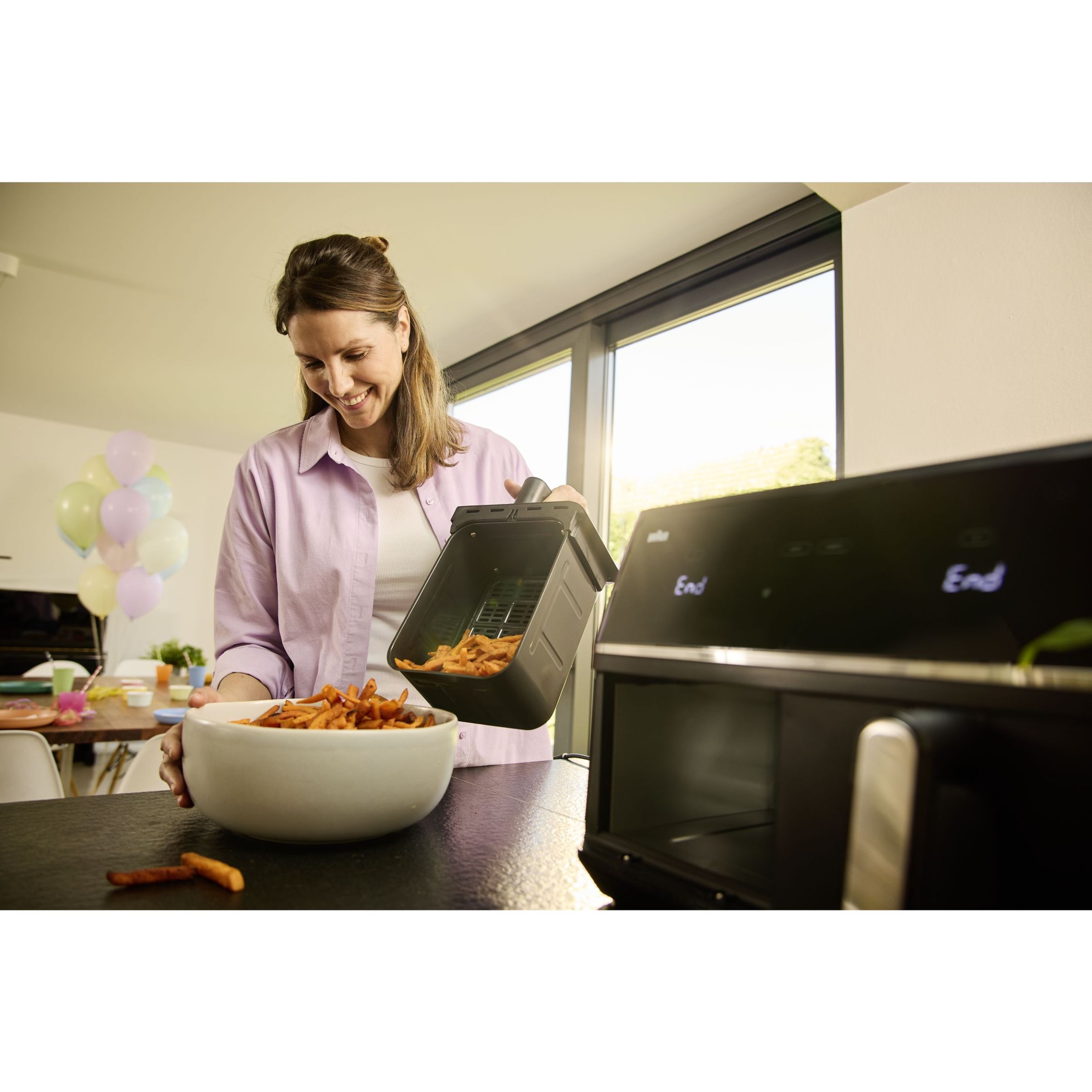 Prepararea unei cantități mari din produsele preferate ale familiei tale a devenit mai rapidă și mai ușoară. Cele două sertare foarte mari de 5 litri ale aparatului BRAUN TwinCook 5 te ajută să pregătești cu ușurință o masă completă. Prăjește un pui întreg de 1,4kg cu legume, ambele în același timp: funcția Sync simplifică acest lucru! Funcția Match permite duplicarea setărilor pentru ambele sertare, astfel încât să poți prepara 2,4kg de cartofi prăjiți. Și, datorită tehnologiei RealAir, vei obține gustul delicios pe care îl adori, cu 50% mai rapid*, utilizând o cantitate foarte mică de ulei și cu până la 90% mai puțină grăsime**.