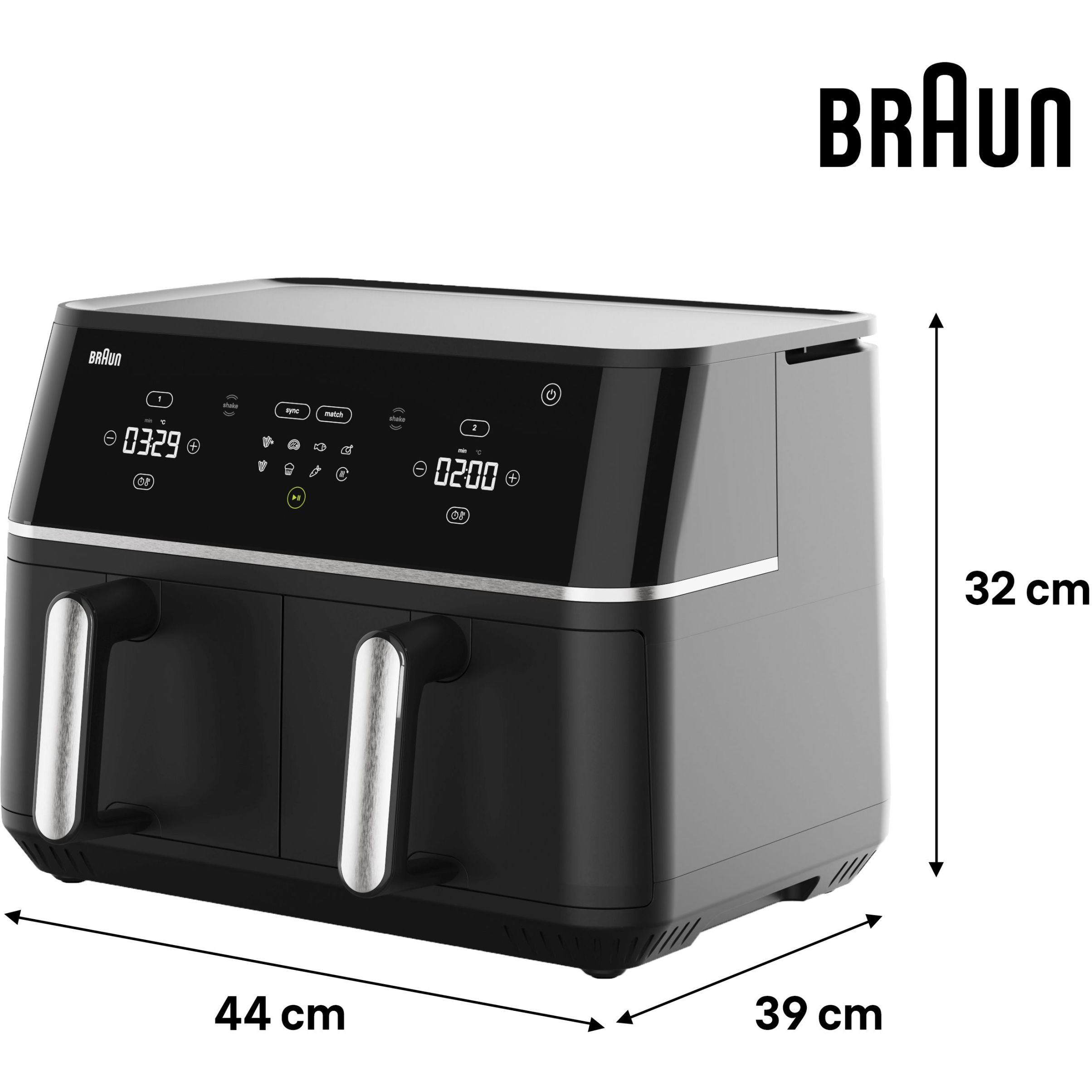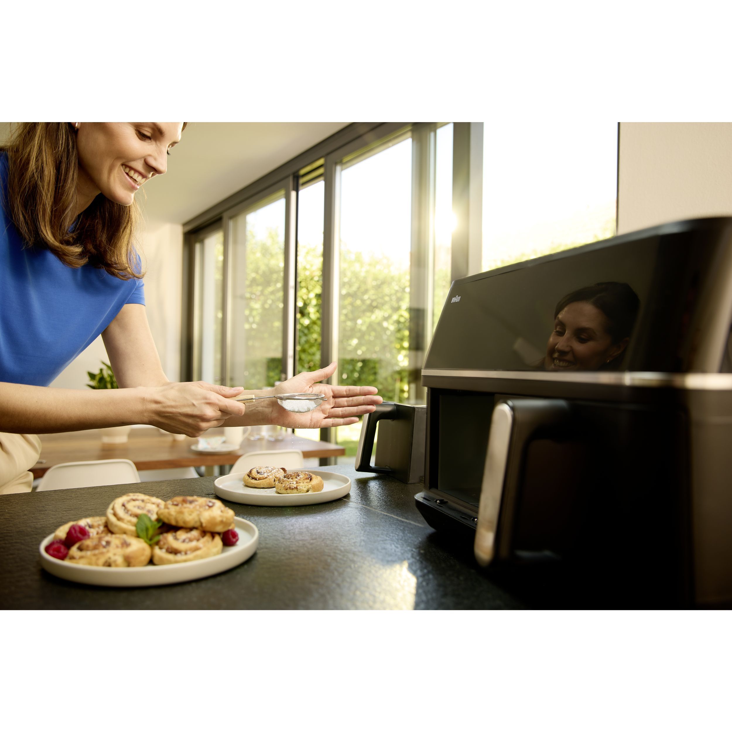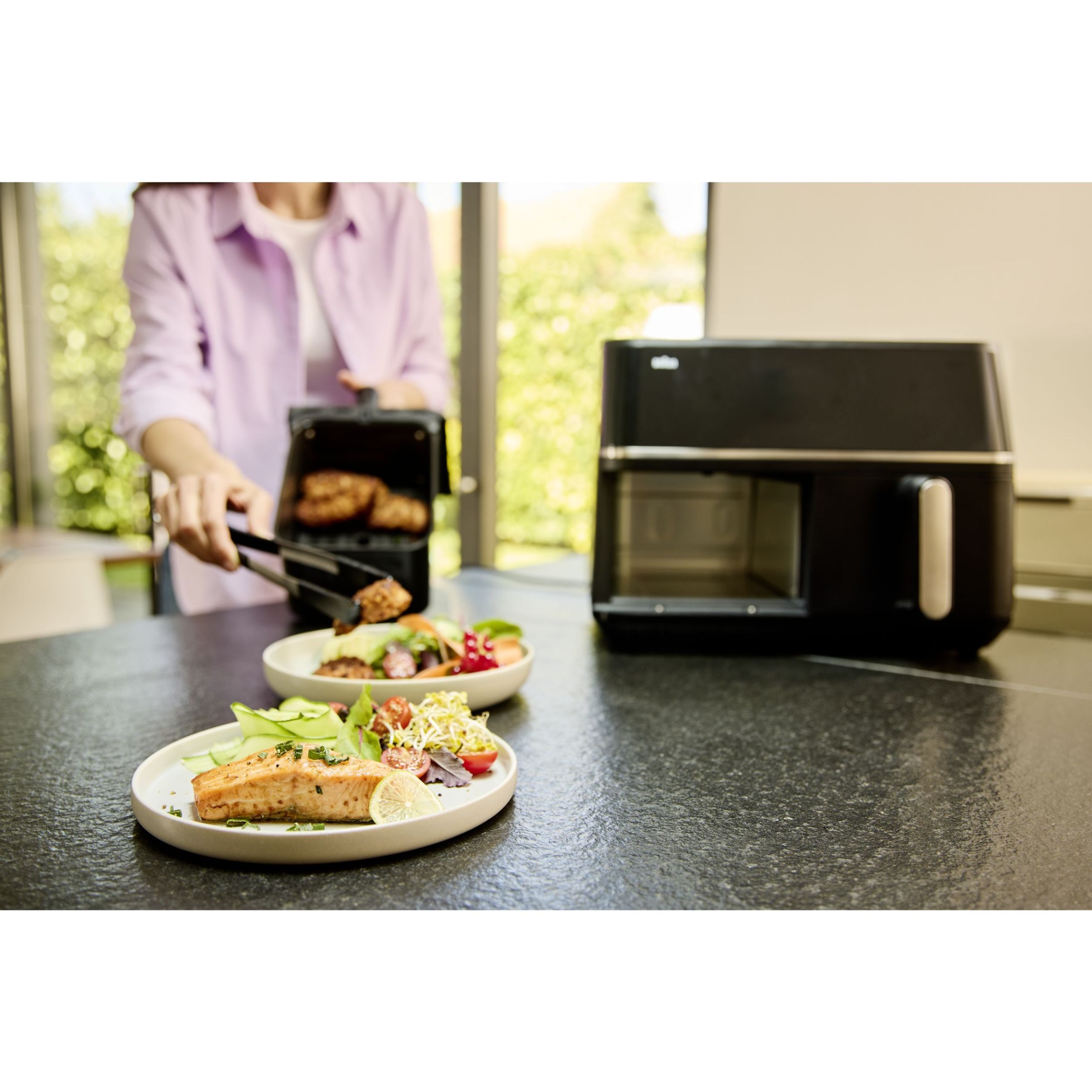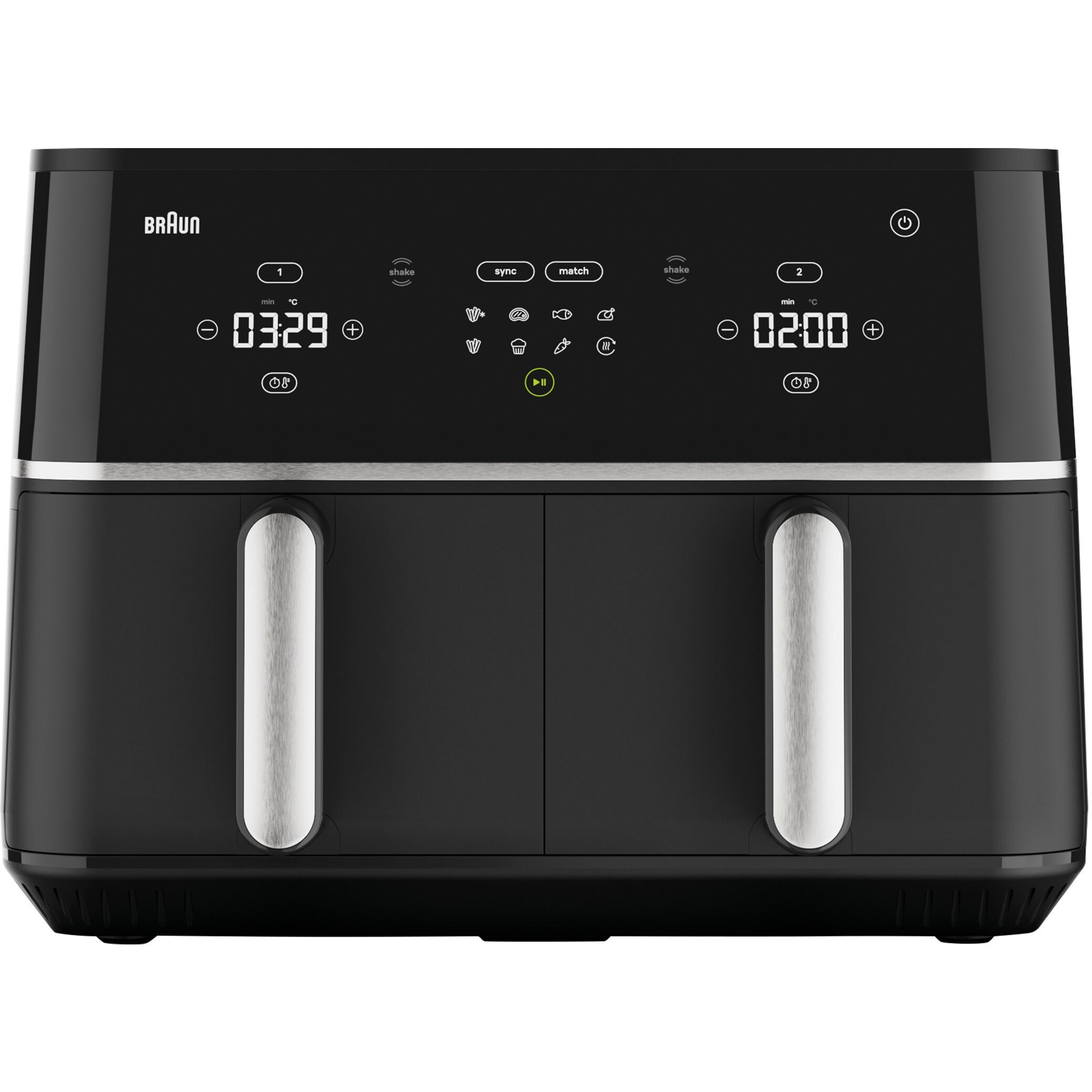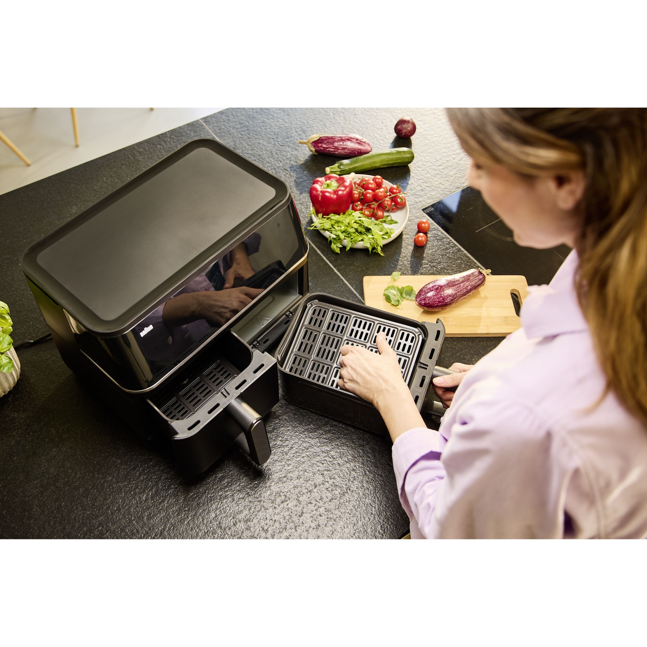 Prepararea unei cantități mari din produsele preferate ale familiei tale a devenit mai rapidă și mai ușoară. Cele două sertare foarte mari de 5 litri ale aparatului BRAUN TwinCook 5 te ajută să pregătești cu ușurință o masă completă. Prăjește un pui întreg de 1,4kg cu legume, ambele în același timp: funcția Sync simplifică acest lucru! Funcția Match permite duplicarea setărilor pentru ambele sertare, astfel încât să poți prepara 2,4kg de cartofi prăjiți. Și, datorită tehnologiei RealAir, vei obține gustul delicios pe care îl adori, cu 50% mai rapid*, utilizând o cantitate foarte mică de ulei și cu până la 90% mai puțină grăsime**.