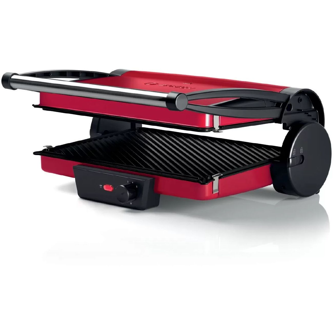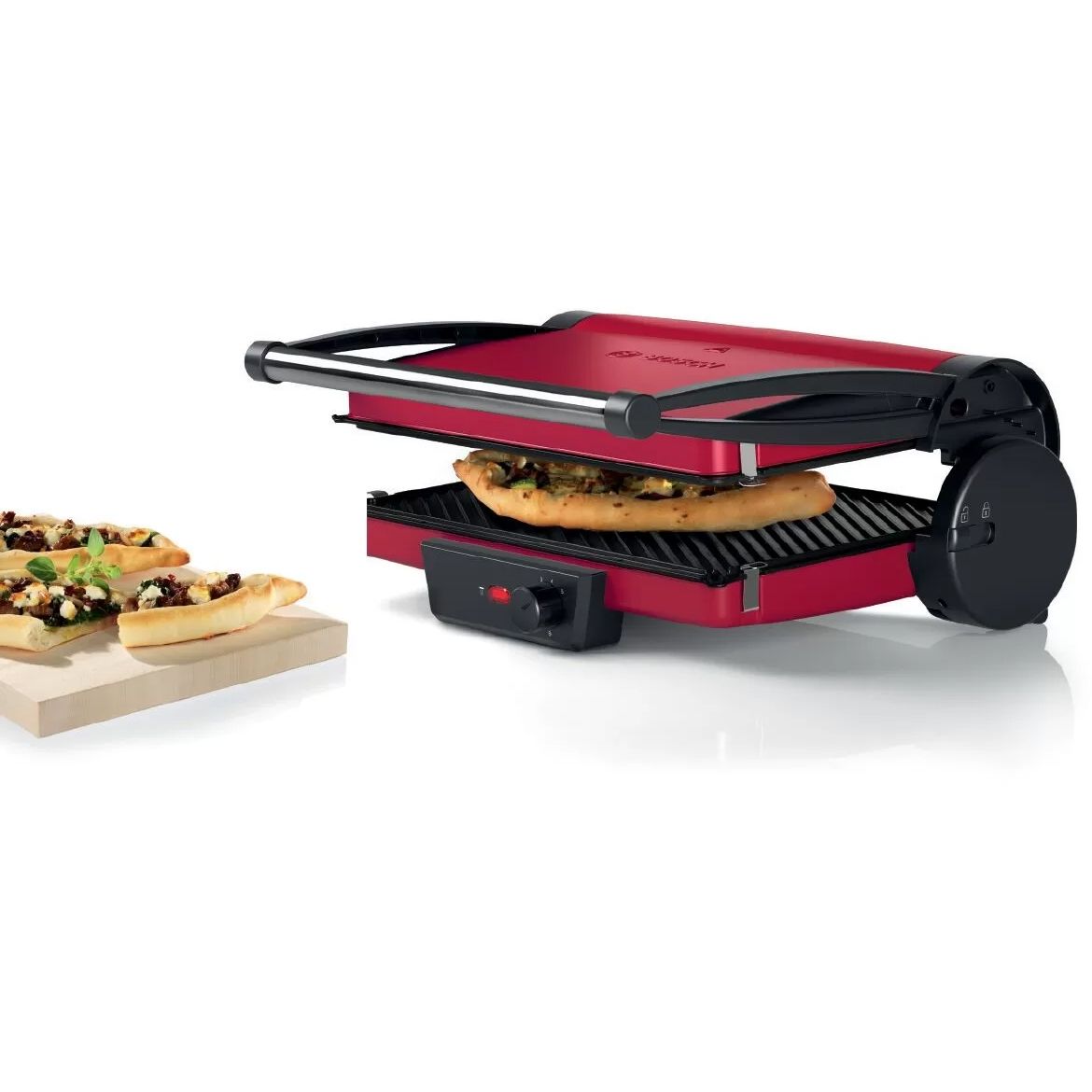Grătar electric BOSCH TCG4104, 2000W, 5 nivele, Corp inox, Plăci grill antiadezive detașabile aluminiu 32.8x23.8cm, Două tăvițe, Termostat reglabil, Păstrare la cald, Depozitare verticală, Red Anthracite