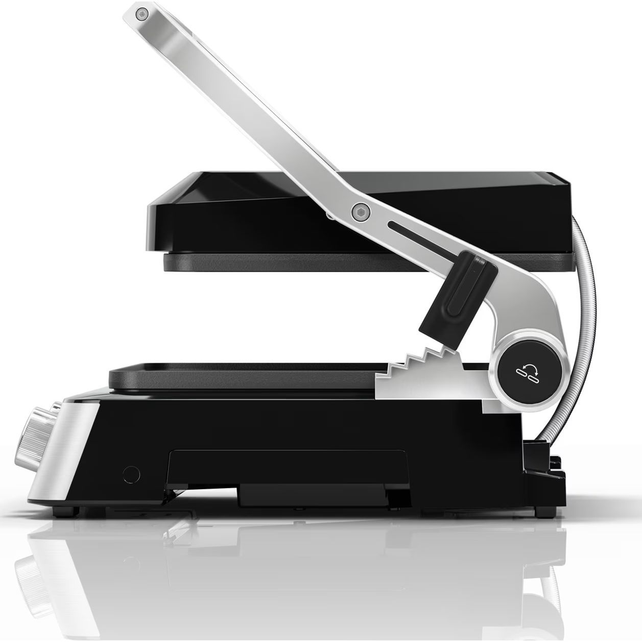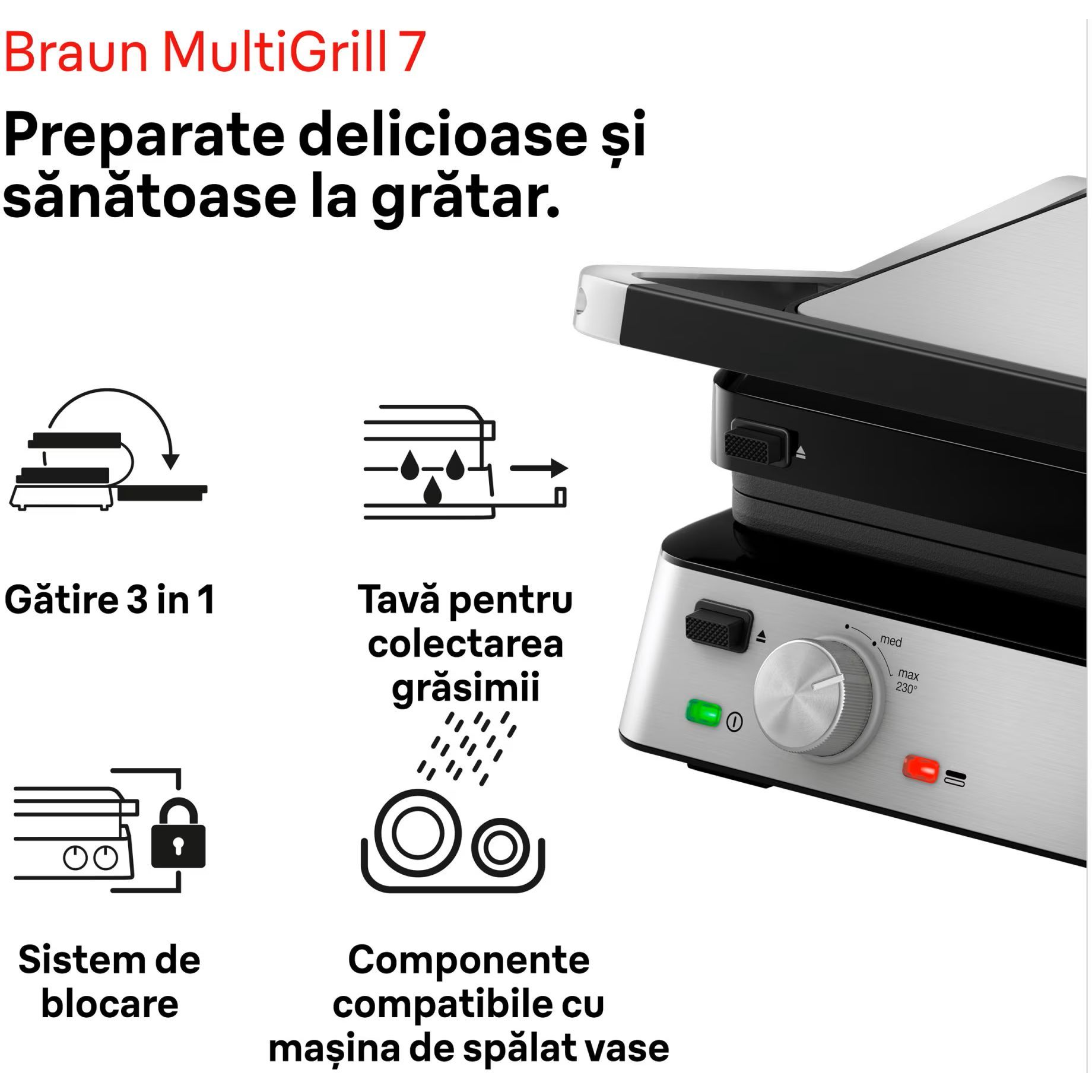 3 moduri de gătit într-un singur produs. Versatilitate maximă datorită modului flexibil de poziționare a grătarului: deschis, tip cuptor sau în direct contact cu alimentele.