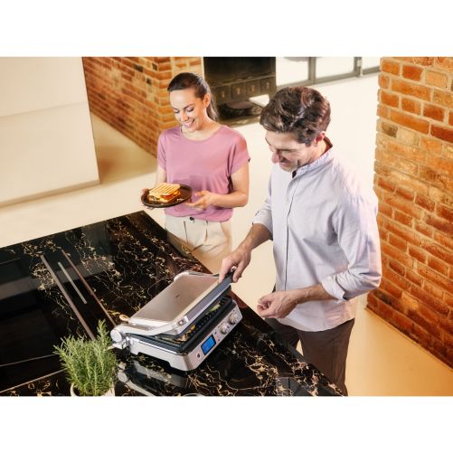 Elementele de încălzire încorporate garantează o încălzire uniformă și mai rapidă. Iar datorită termostatelor independente, poți regla temperatura fiecărei plăci separat pentru a găti două tipuri de alimente simultan.