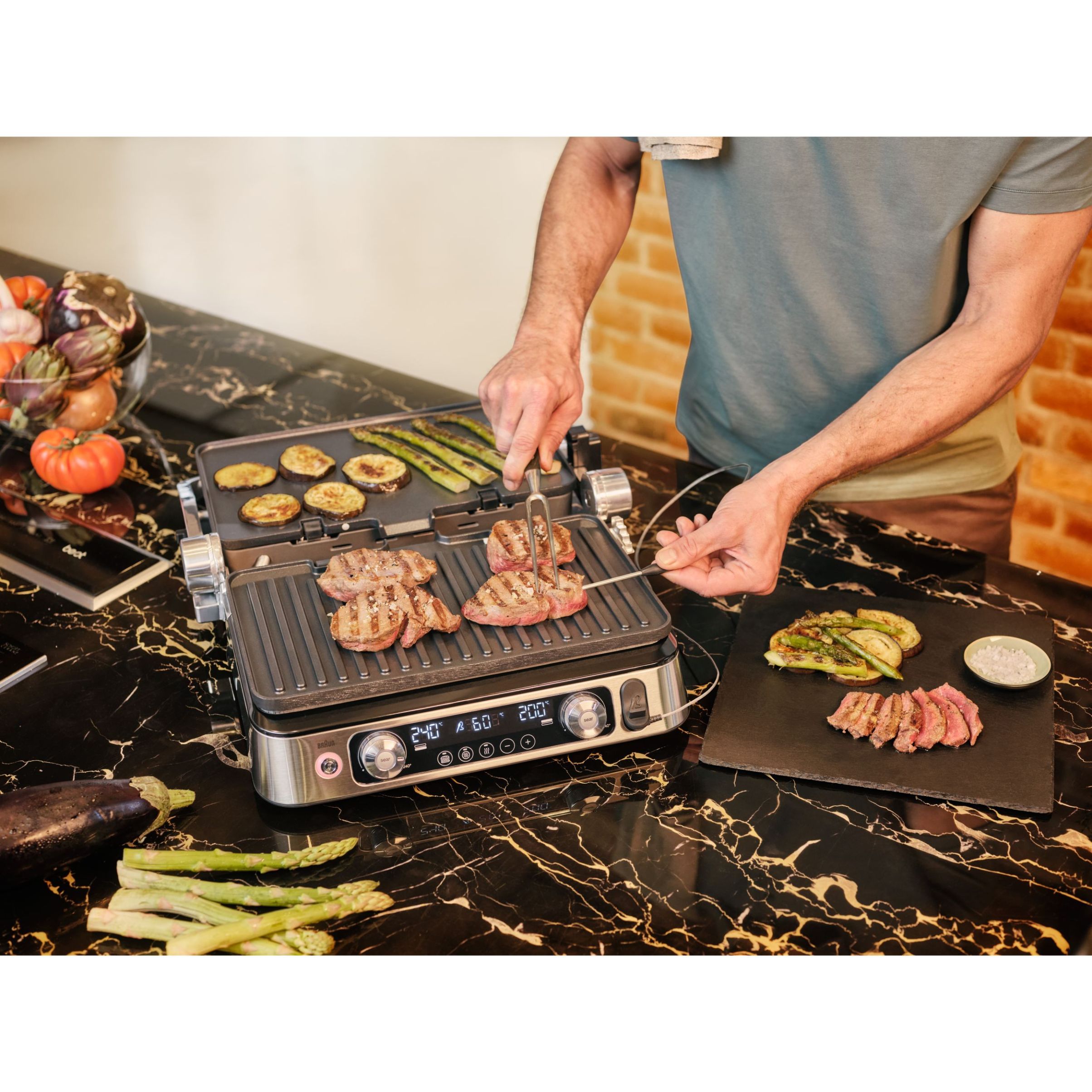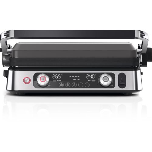 Temperatura fiecărei plăci se poate regla cu precizie, astfel încât să poți găti simultan două tipuri de alimente la două temperaturi diferite.