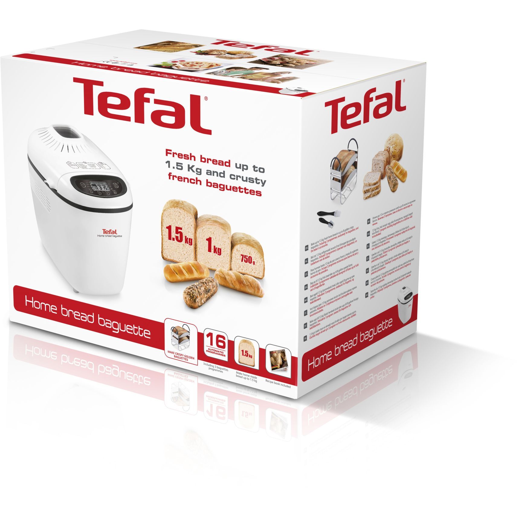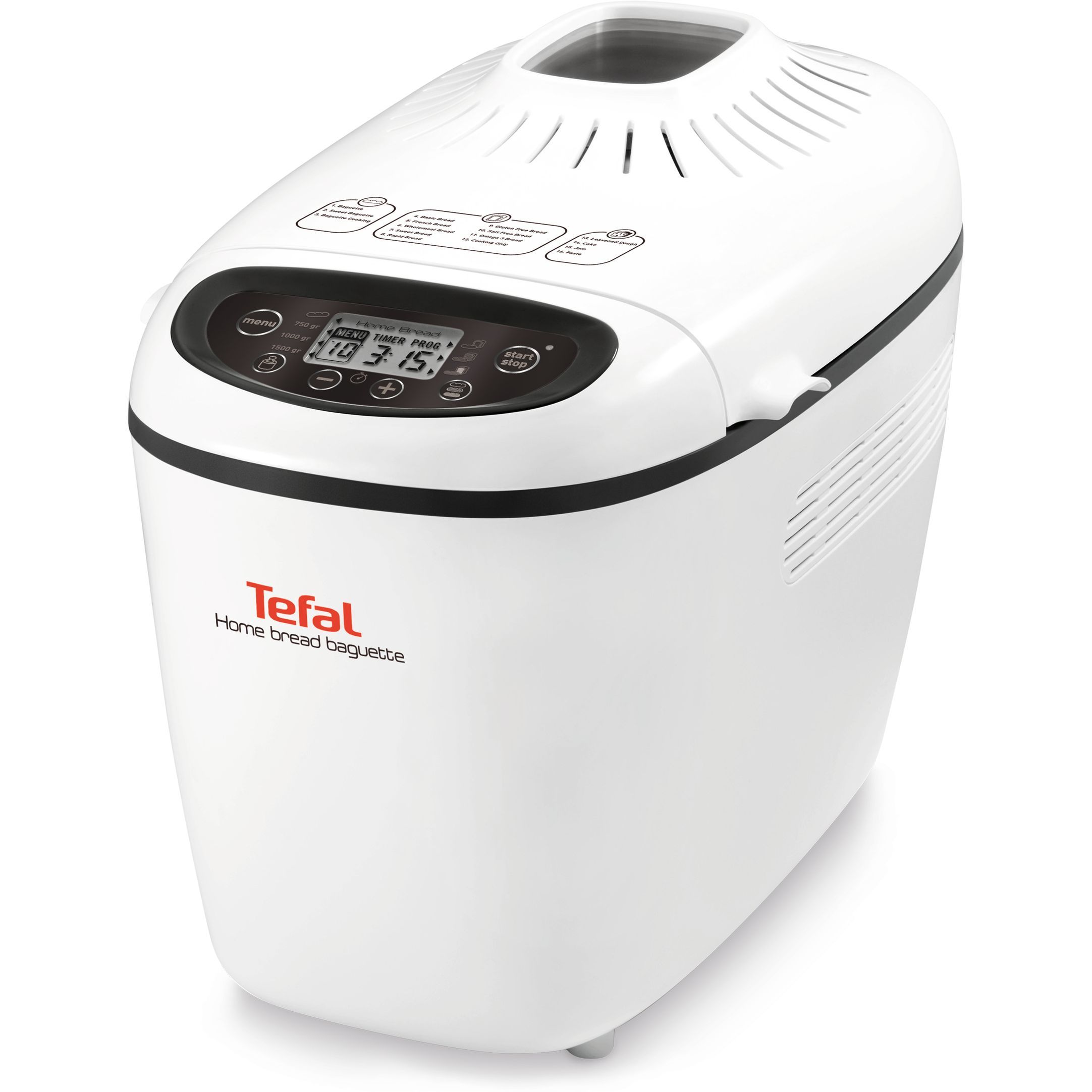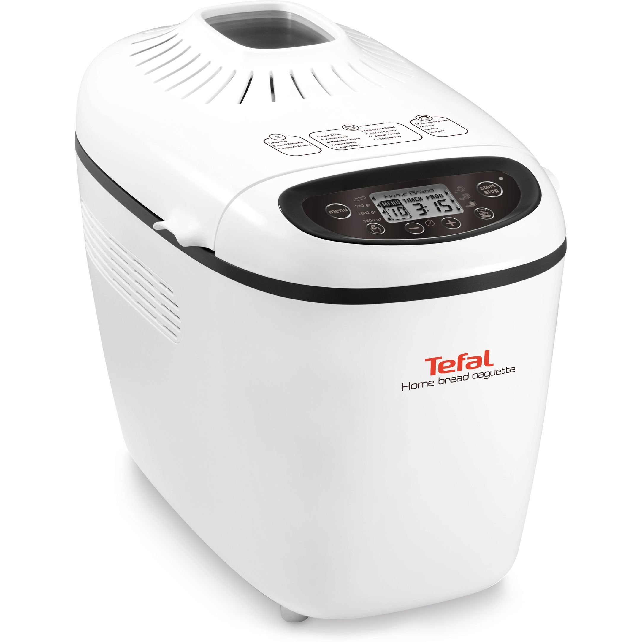 Mașina de pâine TEFAL Home Bread Baguette dispune de 16 programe: baghete, baghete dulci, coacere baghete, pâine simplă, pâine franţuzească, pâine integrală, pâine dulce, pâine rapidă, pâine fără gluten, pâine fără sare, pâine cu omega 3, program pentru copt, program pentru dospit, prăjituri, gem, paste.