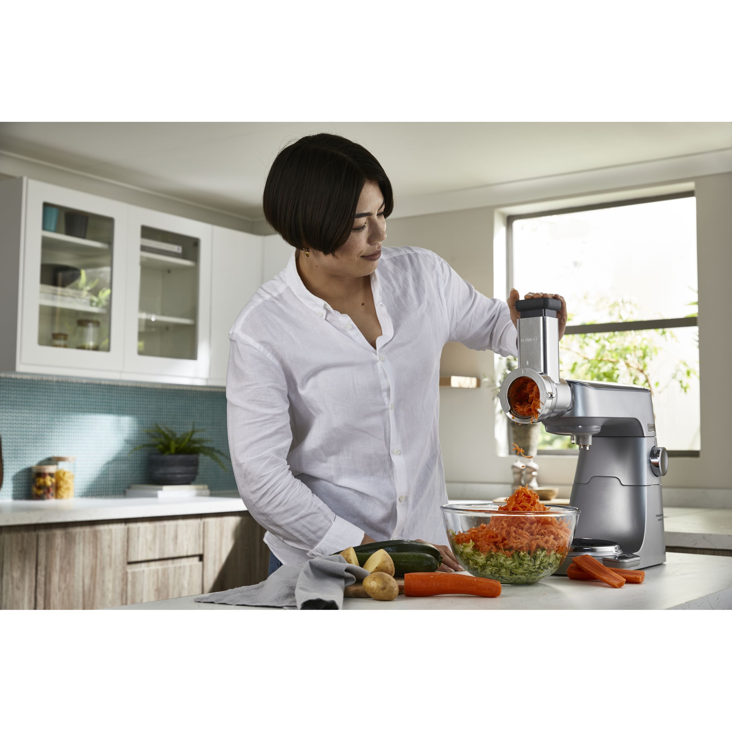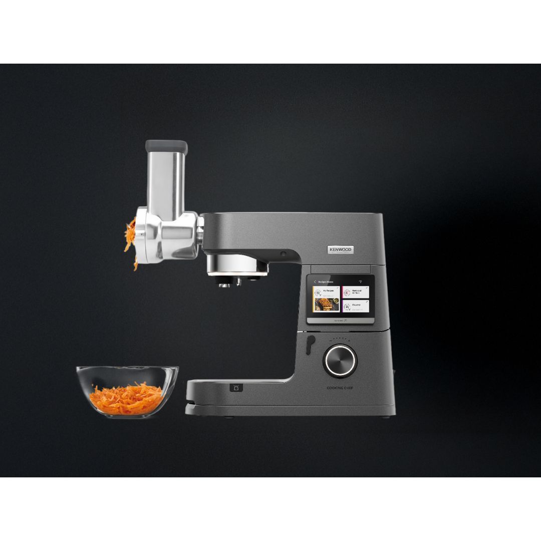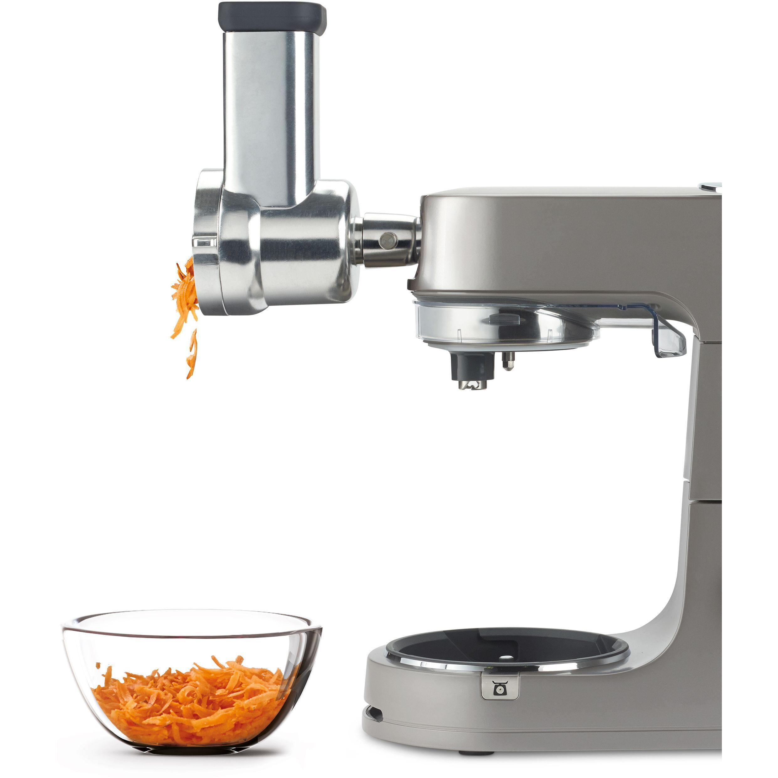 Accesoriul este proiectat fără vas, pentru a permite o acțiune continuă de servire direct în bol sau atunci când aveți cantități mari de pregătit. Acțiunea de rotație lentă a taietorului va menține controlul asupra procesului de maruntire/razuire/feliere, asigurându-va că nu rămâne nimic neprocesat iar ingredientele sunt tăiate exact așa cum va place.