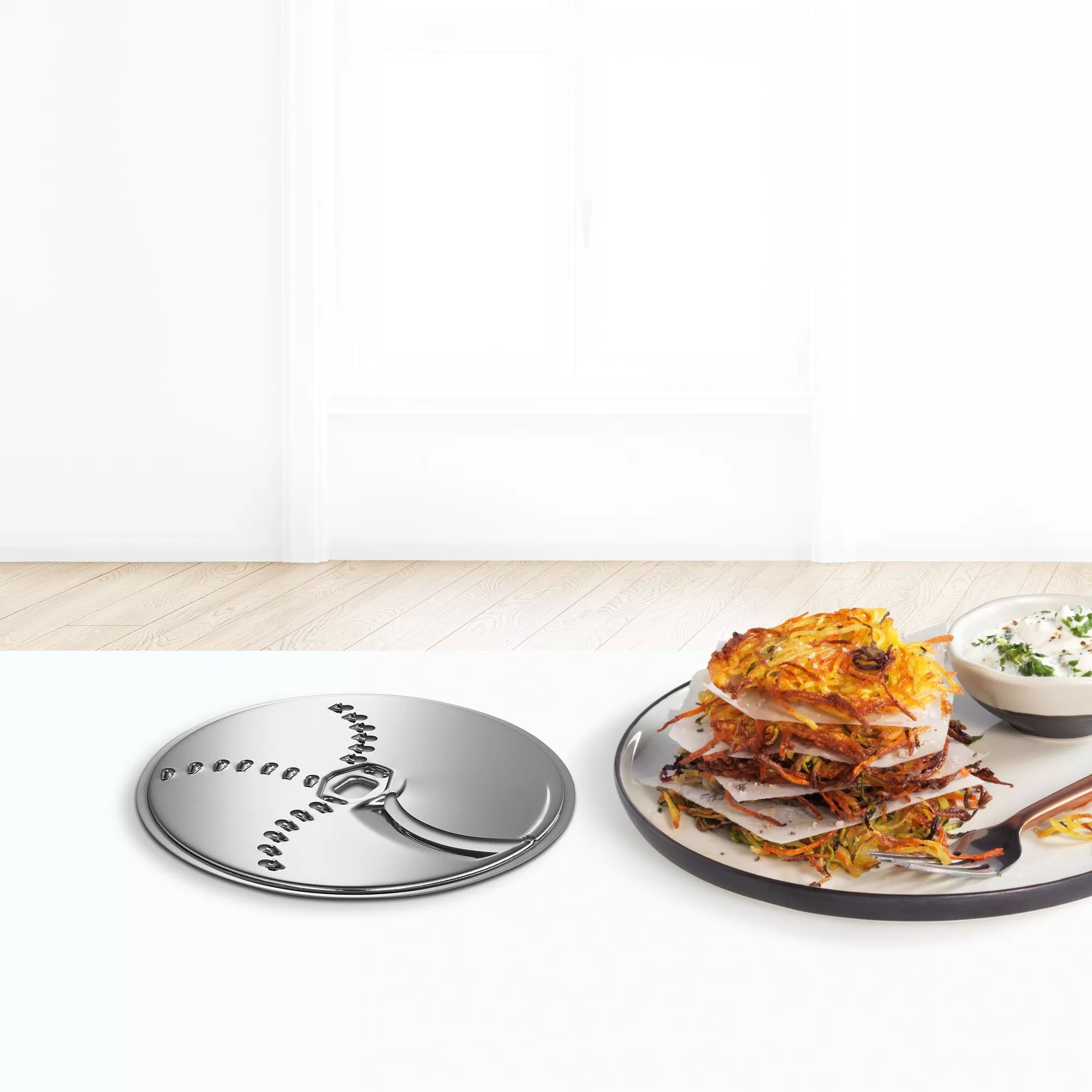 Disc reversibil inox BOSCH Kartoffelpuffer-Rösti-Scheibe MUZ45KP1 - 12039341, Pentru răzuit/feliat cartofi, Nu lasă gust sau miros mâncării, Pentru Serie 4 MUM5, Serie 2 MUMS2, MUM4 și MC8
