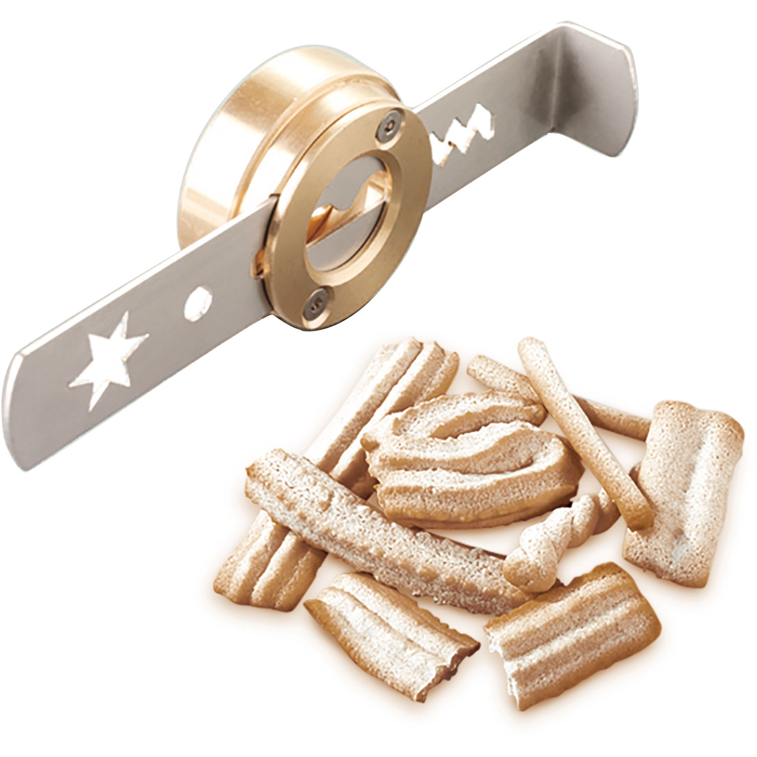 Îmbunătățind versatilitatea accesoriului pentru prepararea pastelor, cu ajutorul acestei matrițe reglabile puteți crea biscuiți uniformi, grisine și fursecuri.