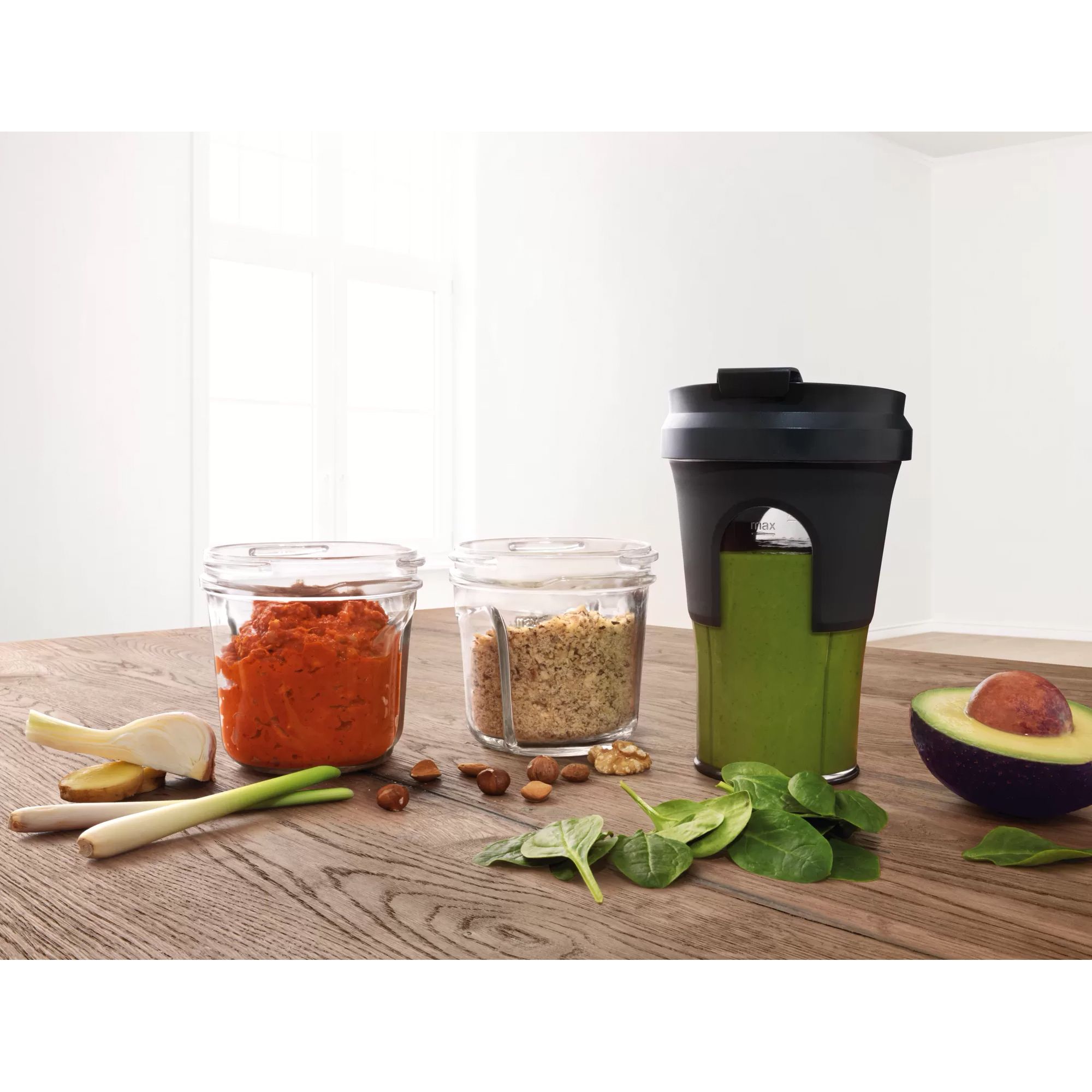 Pregătiți proaspăt, savurați imediat, luați cu dumneavoastră sau pur și simplu depozitați. Cele două recipiente din sticlă pentru depozitare precum și cel ToGo se închid ușor cu capace asortate. Astfel, puteți depozita totul convenabil.