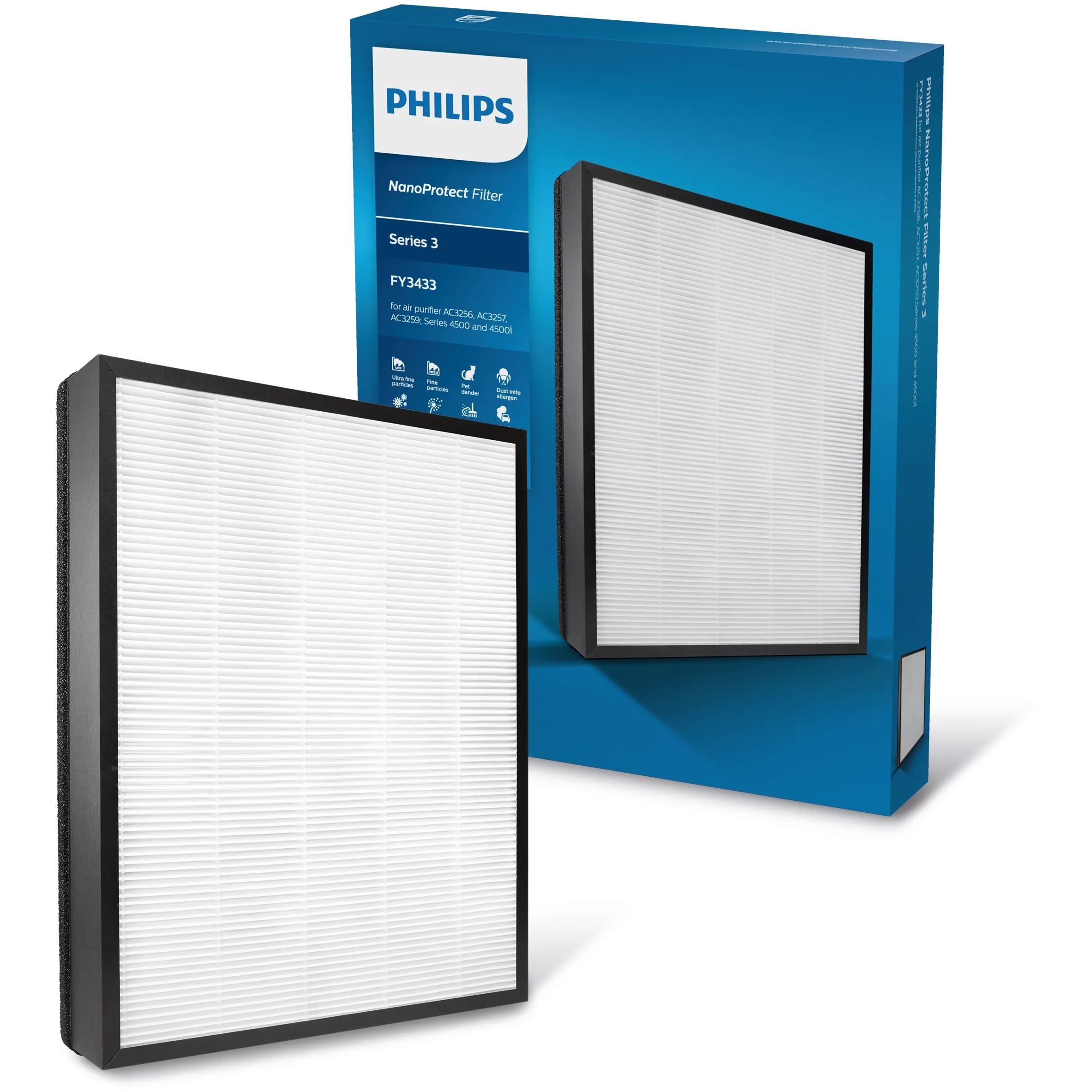 Filtrează 99,97 % din particulele de 0,3 µm. Filtrul HEPA NanoProtect seria 3 de la Philips este realizat dintr-un material de înaltă calitate. Poate să capteze până la 99,97 % din particulele foarte fine, cu dimensiuni chiar şi de 0,3 microni: dimensiunea celor mai obişnuiţi alergeni din aer, a particulelor periculoase, a bacteriilor şi a virusurilor. Filtrul de calitate superioară cu structură fermă şi stabilă asigură că tot aerul trece prin filtru şi oferă o eficienţă de filtrare ridicată.
