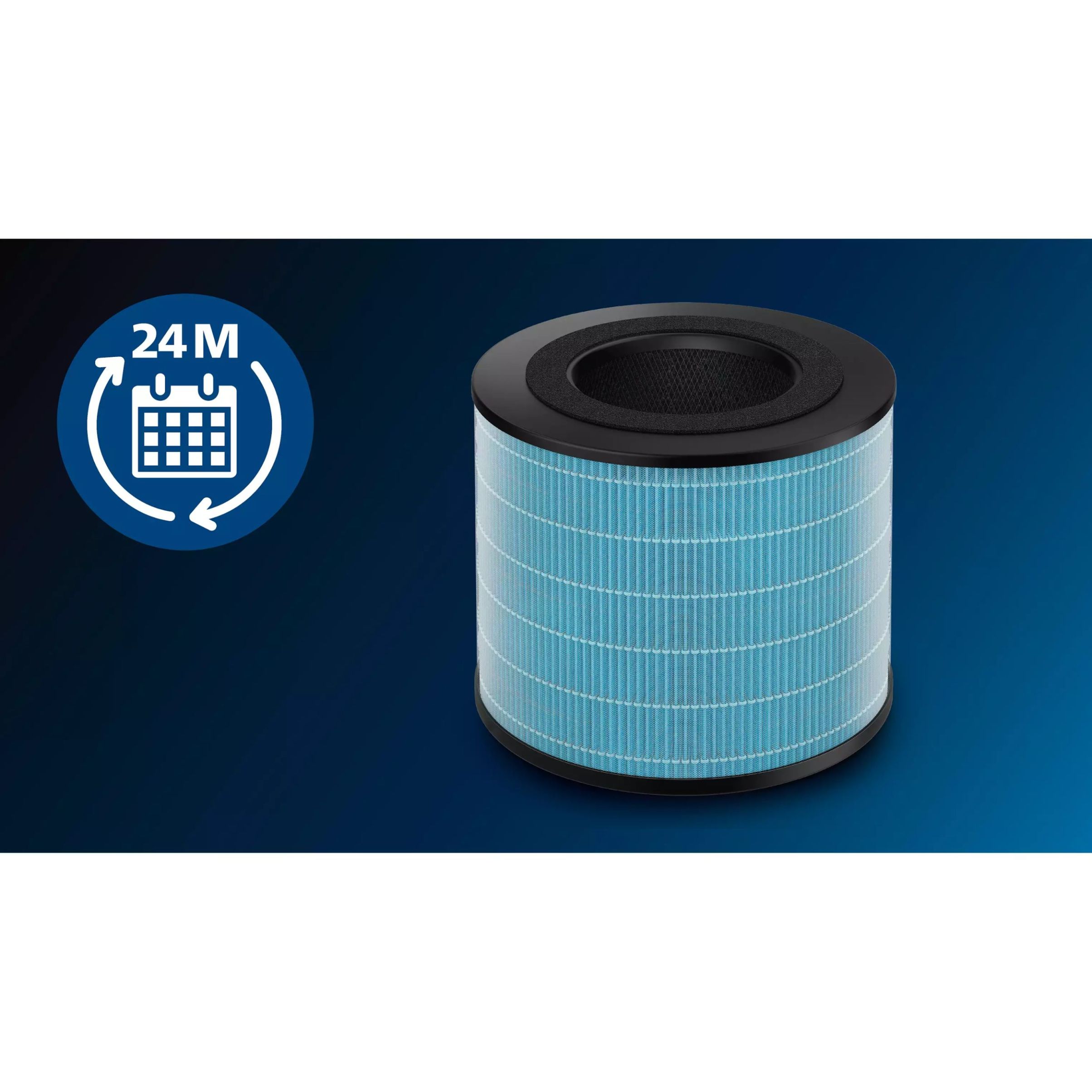Filtrul cilindric 3-în-1 combină trei straturi de filtrare pentru a menţine dispozitivul în stare de funcţionare ca în prima zi.(6) Filtru cu cărbune activ, HEPA şi prefiltrul sunt combinaţia optimă care elimină substanţele poluante, virusurile, alergenii şi bacteriile. Pentru a vă asigura că respiraţi aer mai curat, vă recomandăm să schimbaţi toate cele trei filtre simultan.