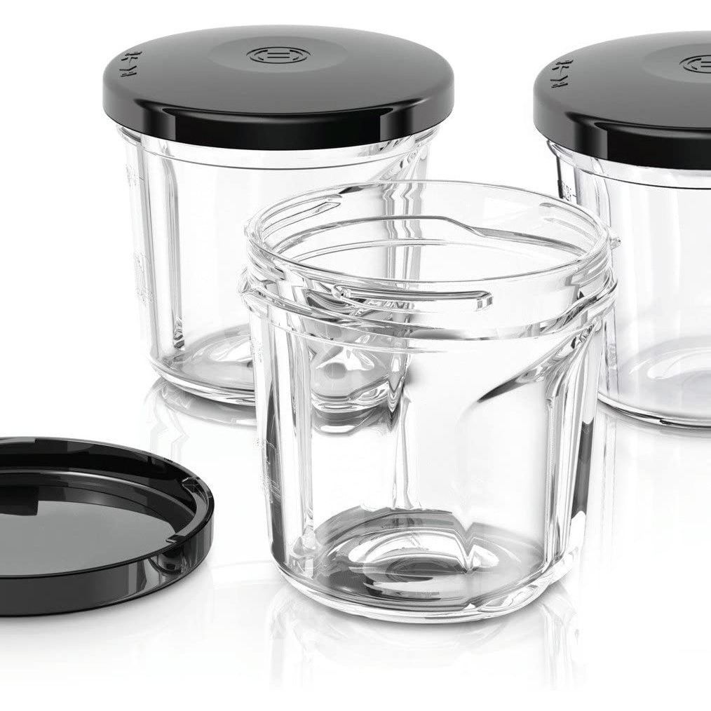 Pregătiți proaspăt, savurați imediat, luați cu dumneavoastră sau pur și simplu depozitați. Cele două recipiente din sticlă pentru depozitare precum și cel ToGo se închid ușor cu capace asortate. Astfel, puteți depozita totul convenabil.