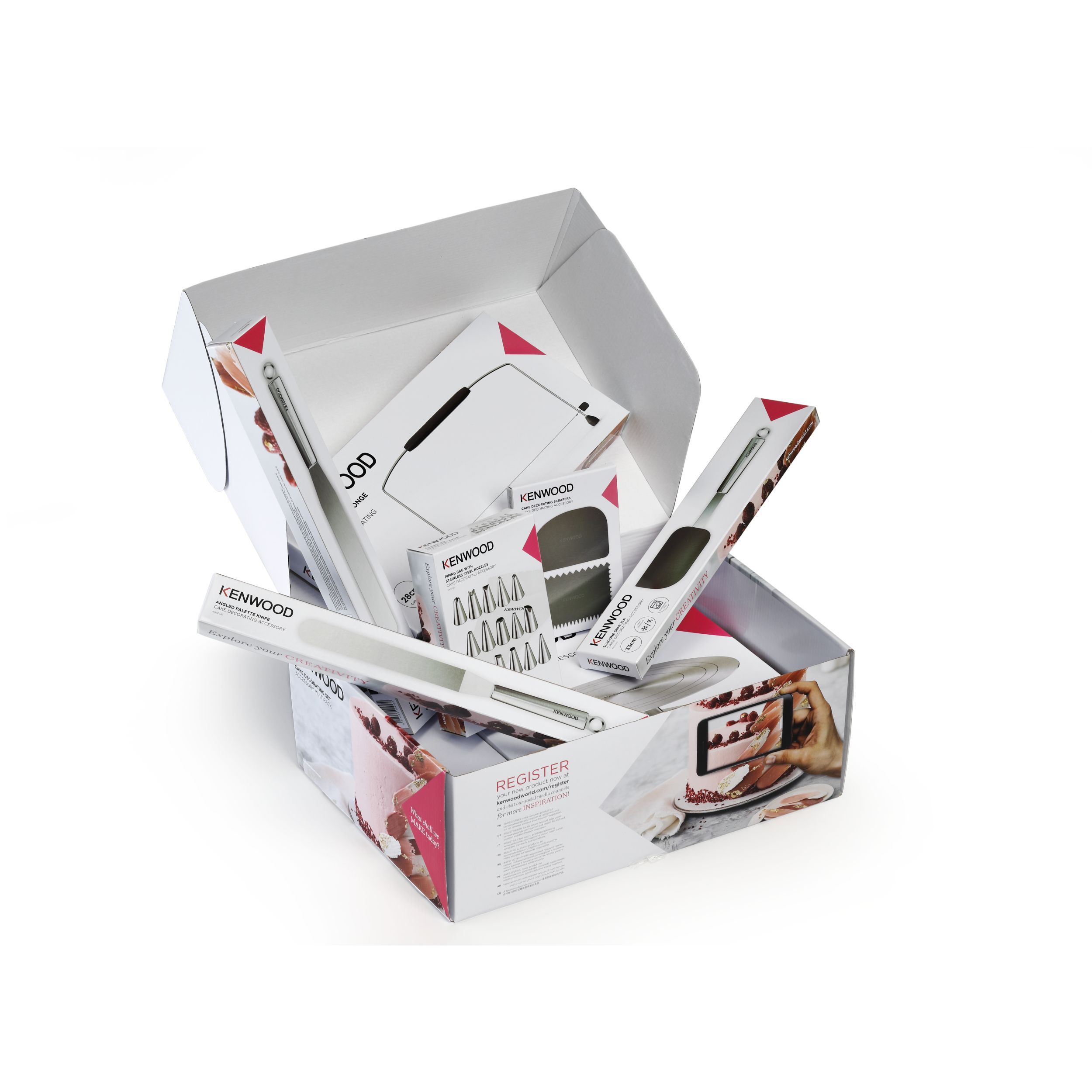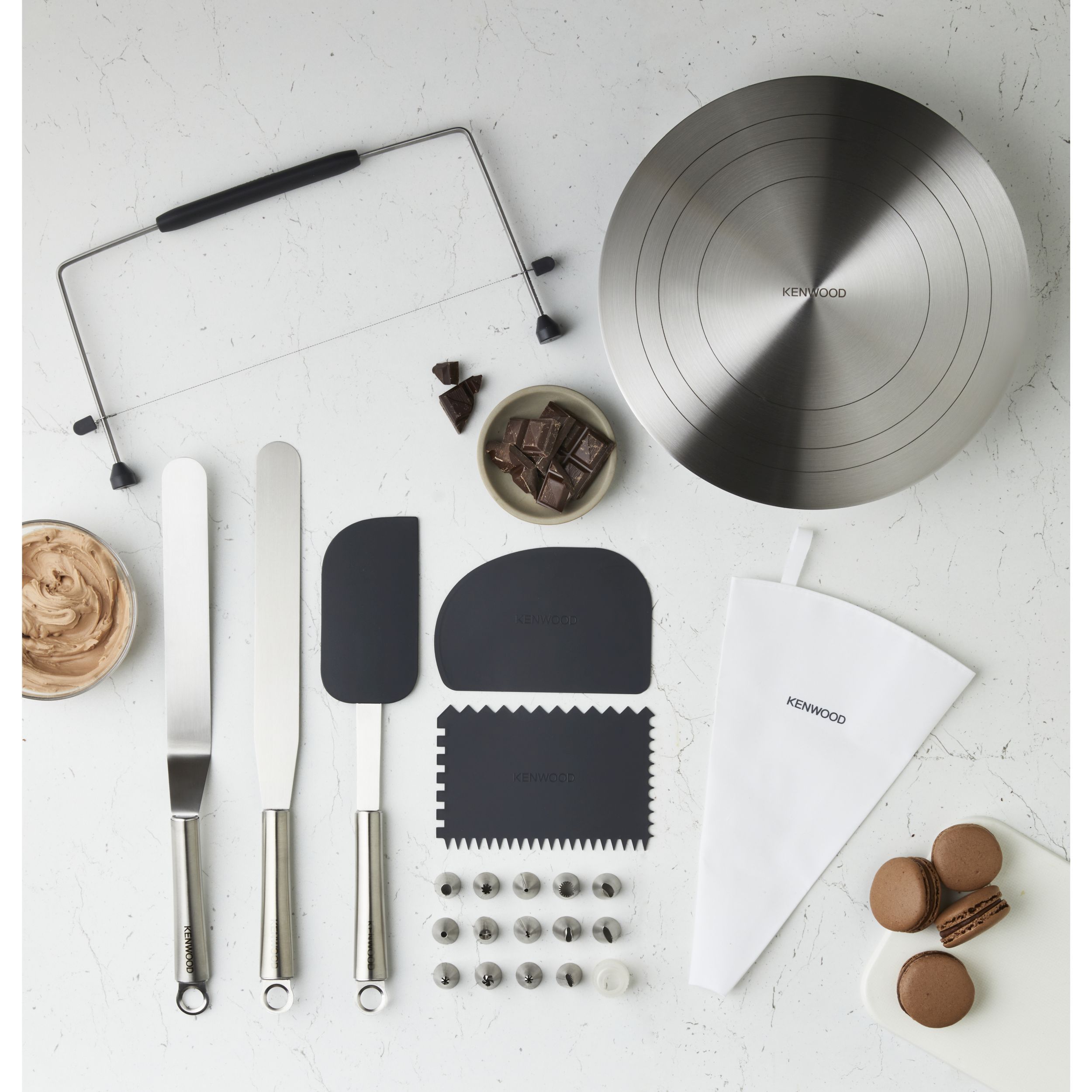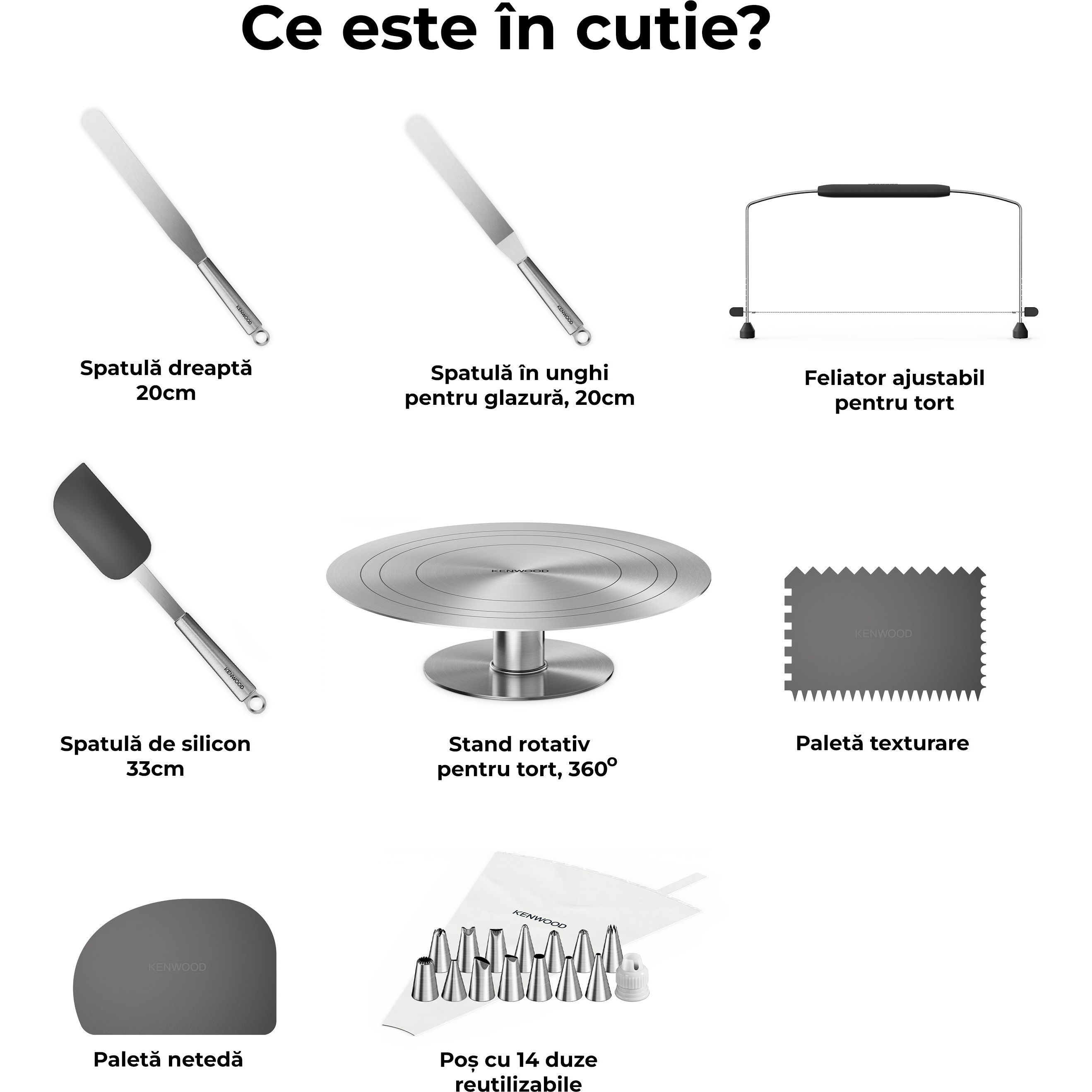 Fiind compus din 2 palete, spatulă de silicon, palete destinate decorării, poș cu 14 duze, feliatorul ajustabil și un stand rotativ din oțel inoxidabil, vei avea la dispoziție toate uneltele necesare pentru a adăuga acel factor WOW!