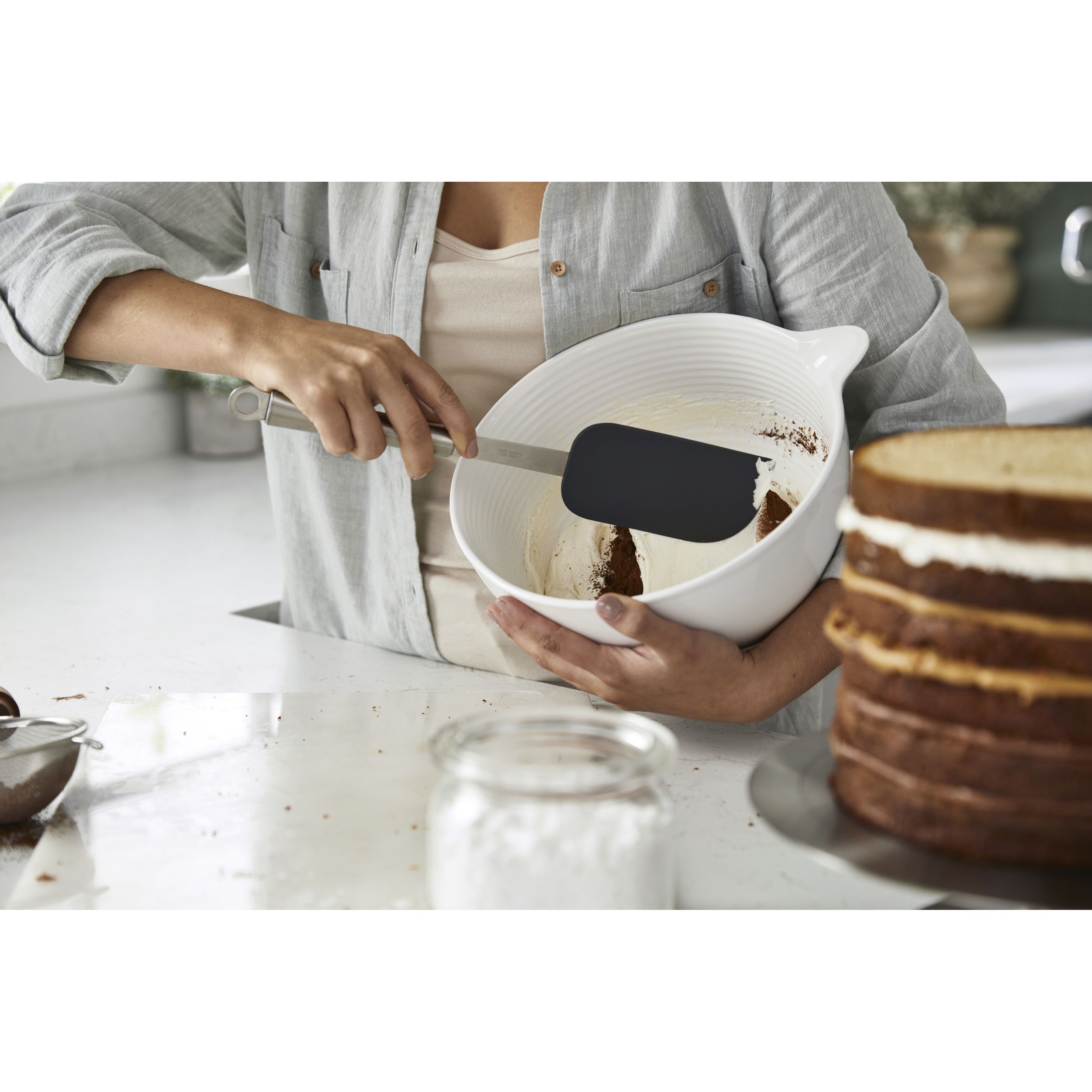 Spatula flexibilă adună tot amestecul cu ușurință. Are un corp din oțel inoxidabil pentru cea mai bună rezistență în timp, iar vârful din silicon este capabil să urmărească toate liniile bolului pentru a aduna cât mai multă compoziție, pentru a profita la maximum de toate resursele investite în proiectul tău.