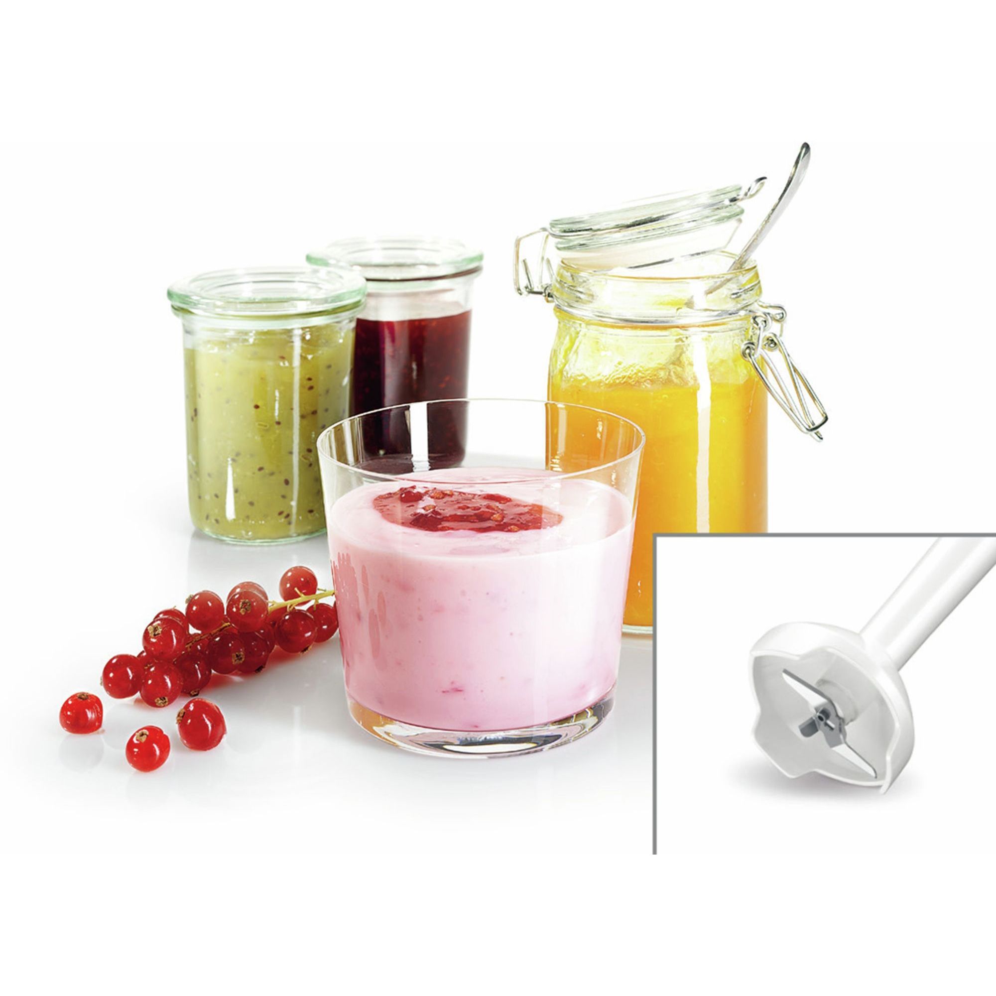 Confort. Pasare, mixare și mărunțire - datorită greutății reduse și a mânerului ergonomic, blenderul CleverMixx se potrivește perfect în mâna ta, fiind simplu și ușor de utilizat. Forma inovativă a piciorului blenderului previne stropirea. Toate accesoriile cu excepţia sistemului de angrenare pentru chopper pot fi curăţate în maşina de spălat vase.
