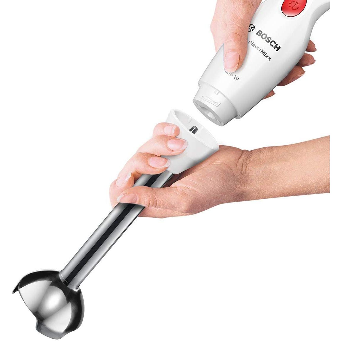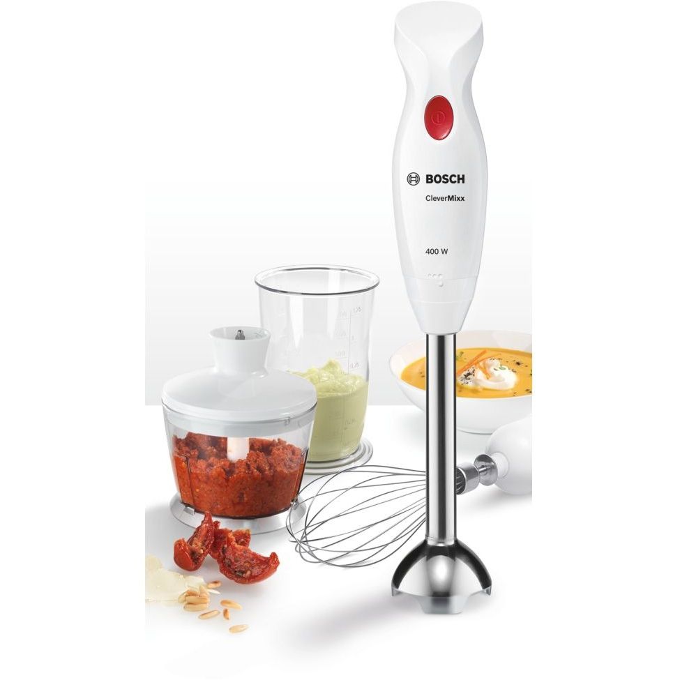 Confort. Pasare, mixare și mărunțire - datorită greutății reduse și a mânerului ergonomic, blenderul CleverMixx se potrivește perfect în mâna ta, fiind simplu și ușor de utilizat. Forma inovativă a piciorului blenderului previne stropirea. Picior blender din inox. Ideal pentru preparare supe fierbinti sau pasare morcovi și roșii. Toate accesoriile cu excepţia sistemului de angrenare pentru chopper pot fi curăţate în maşina de spălat vase.