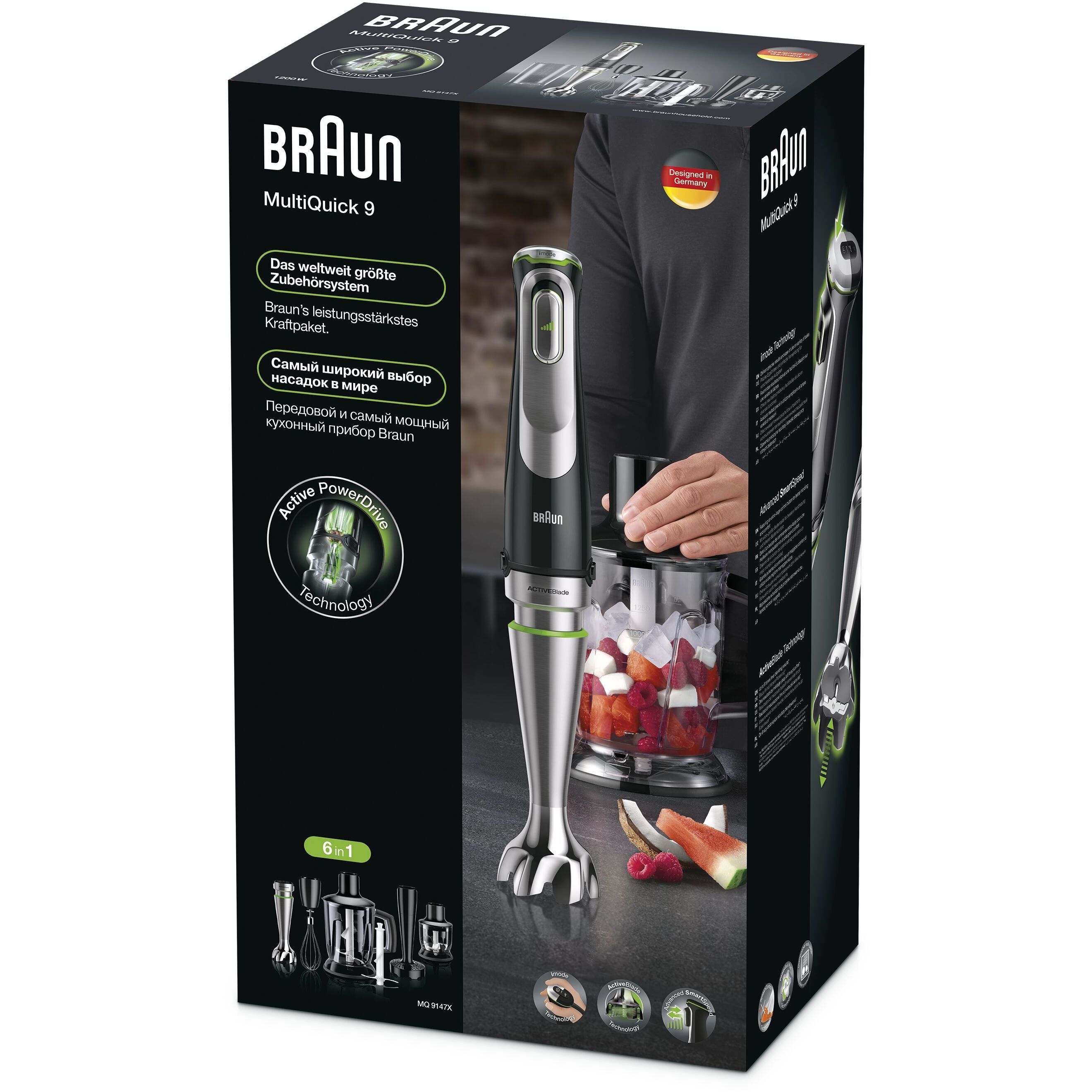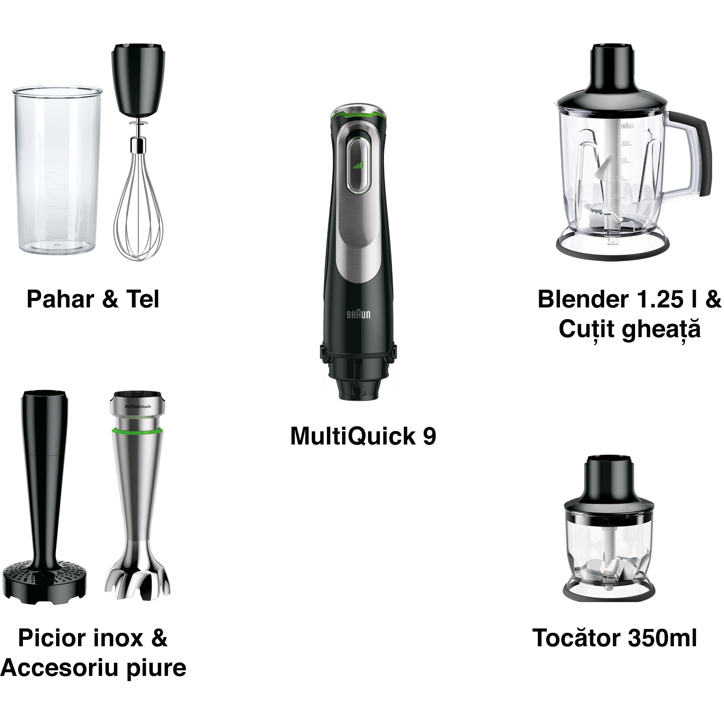 Blender de mână BRAUN MultiQuick 9 MQ9147X, 1000~1200W (variabilă și Pulse), Lame ActiveBlade, Active PowerDrive, iMode, Advanced SmartSpeed, SplashControl, Cablu 1.2m, Premium Black