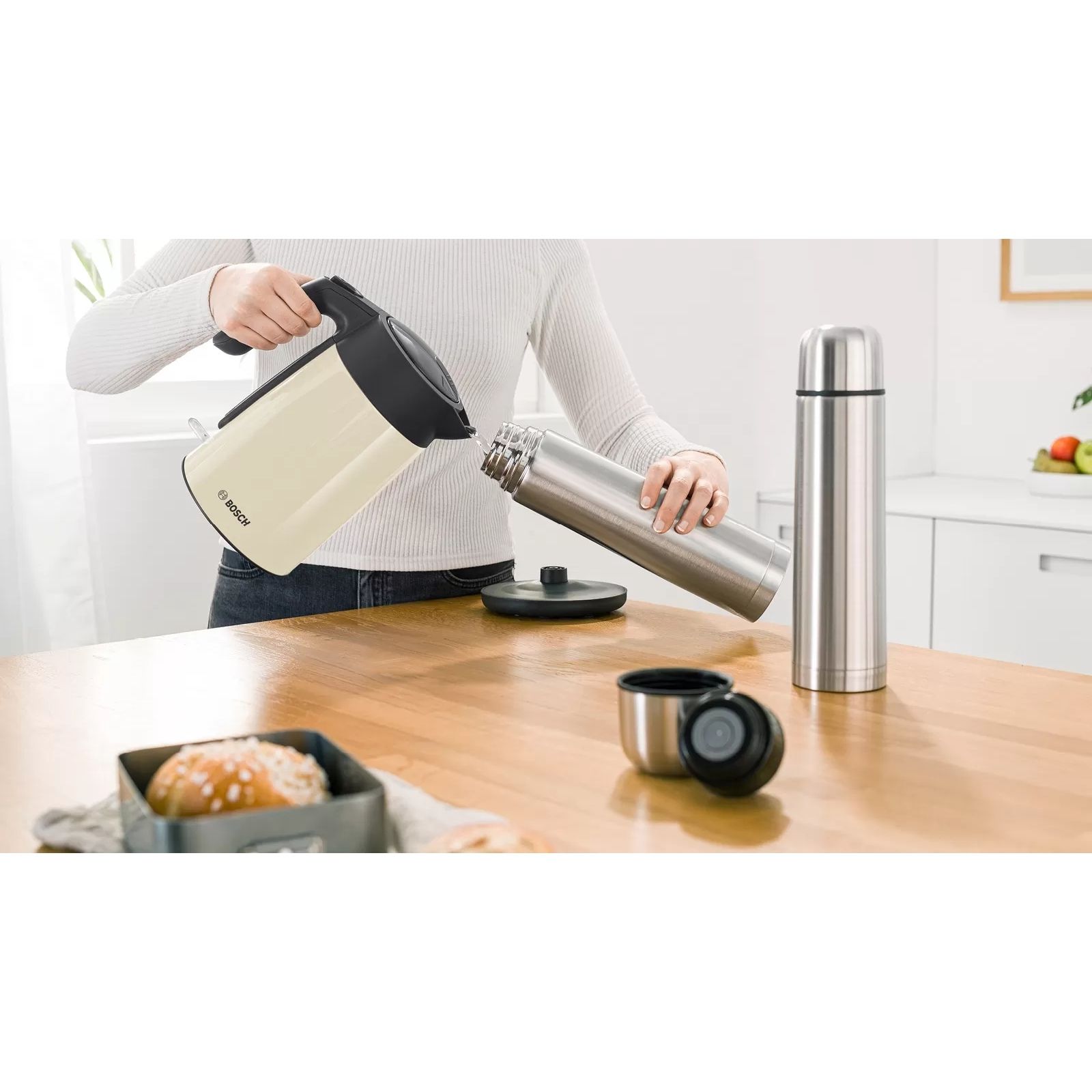 Umplerea fierbătorului cu apă trebuie să fie cât mai confortabilă posibil. Capacul acestui fierbător poate fi deschis prin atingerea unui buton.