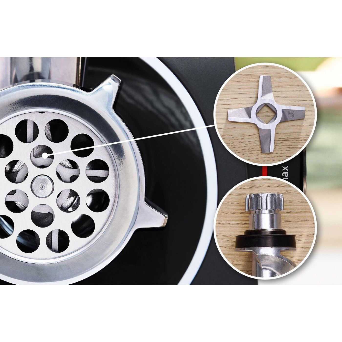 De obicei, mașinile de tocat au un cuțit cu un singur tăiș. Cuțitul din oțel inoxidabil, cu două tăișuri, garantează întotdeauna o utilizare ușoară și tocarea ușoară a ingredientelor. Cuțitul se potrvește perfect, mărunțește carnea și legumele și este ușor de montat și de curățat.