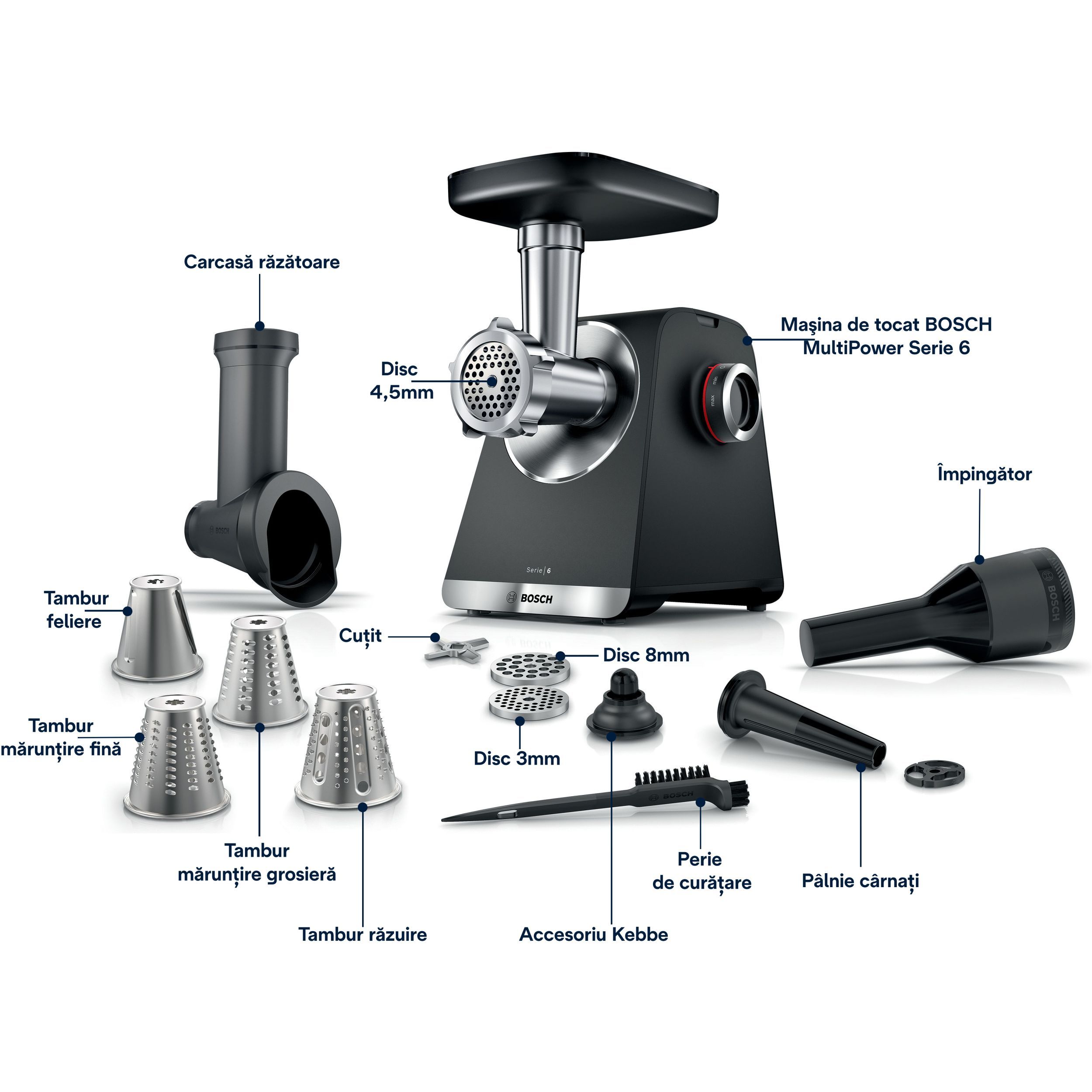 Dezlănțuie sărbătoarea. Mașina de tocat de mare performanță BOSCH MultiPower Serie 6 procesează 3,5kg de carne pe minut, cu motorul său de 2100 wați și camera sa mare
