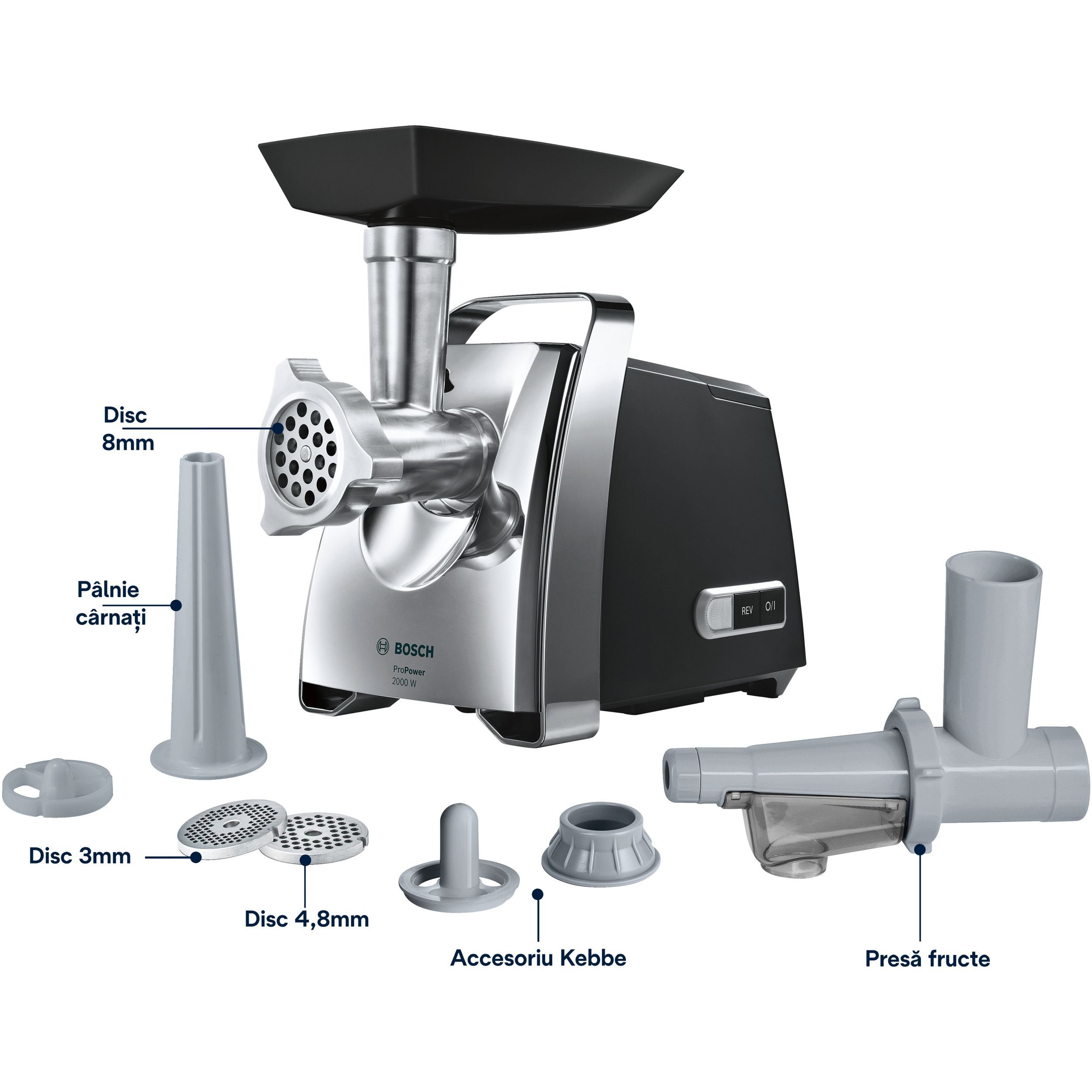 • Motor puternic de 2000 W în sarcină maximă: pentru procesarea uniformă a cărnii în cel mai scurt timp;