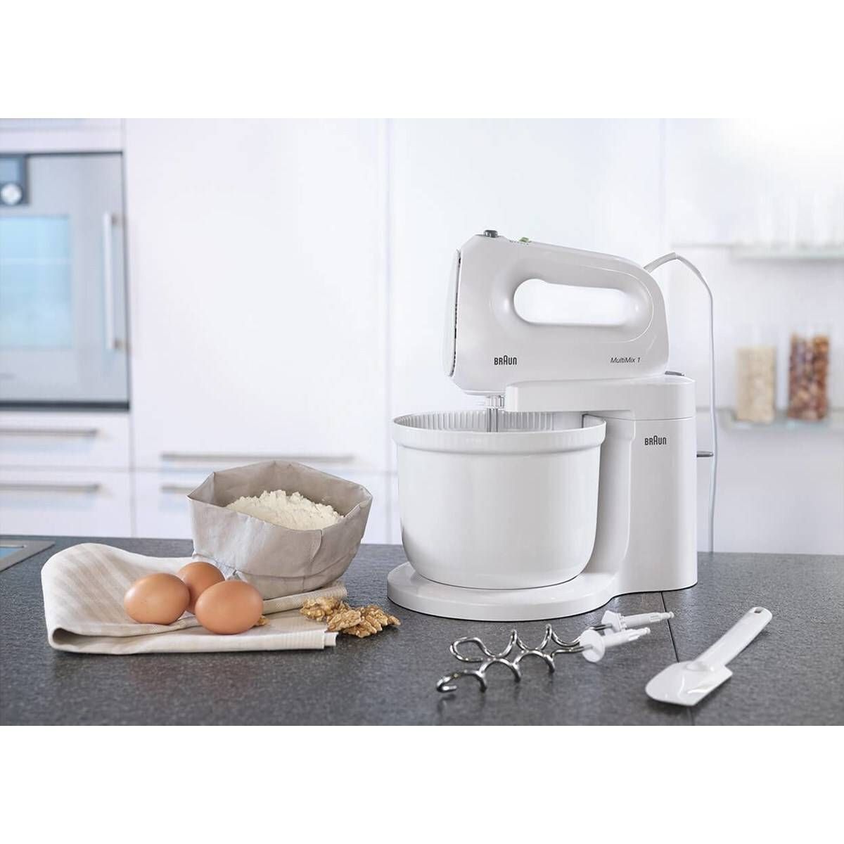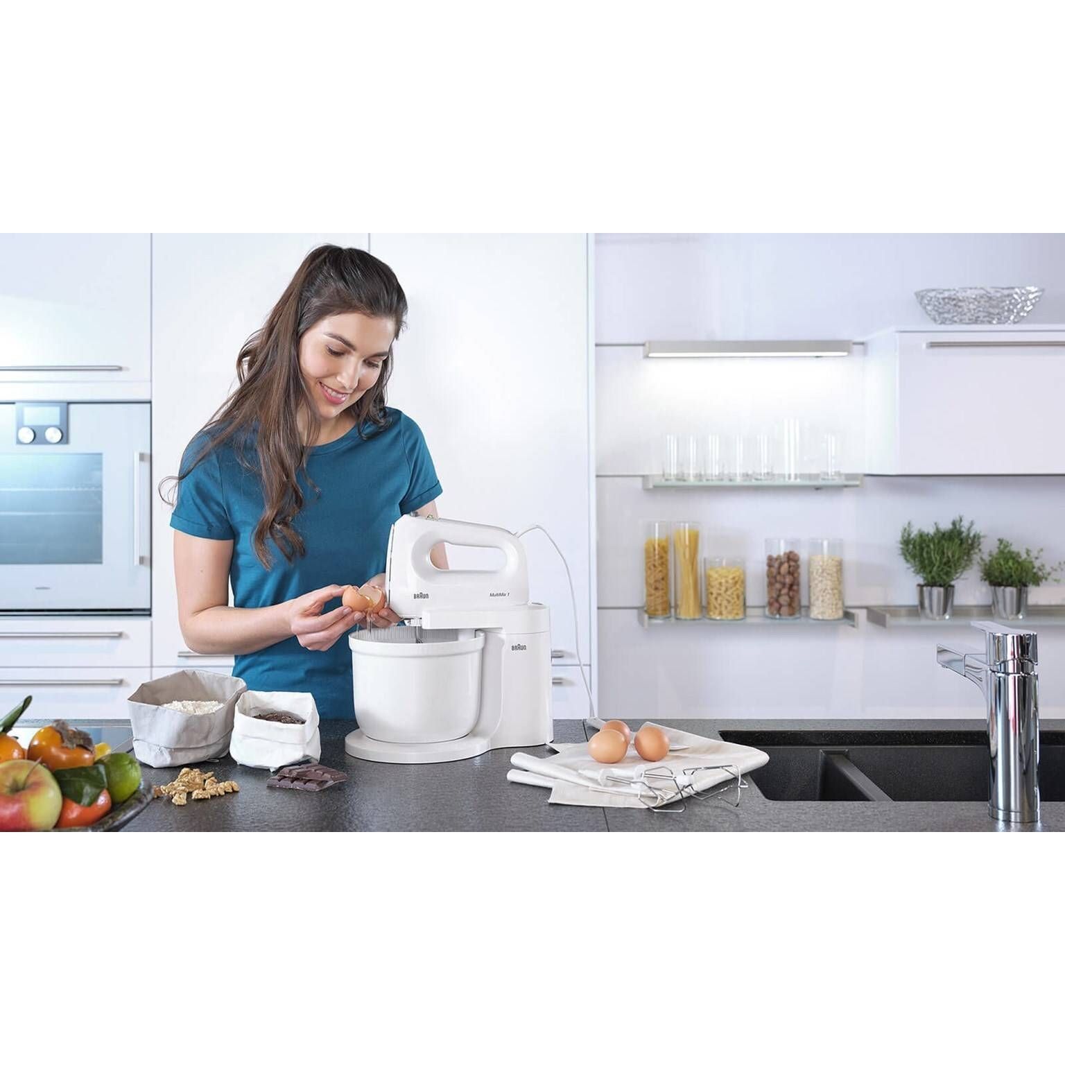 2-în-1 mixer. Utilizați mixerul ca procesor de alimente folosind piciorul de amestecare și bolul de amestecare sau experimentați un control optim ținând mixerul ușor de mână în mână.