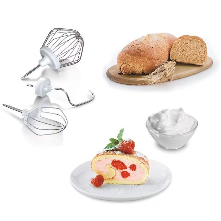 Ai accesoriile potrivite pentru o multitudine de preparate. Telul, paleta pentru amestecat și cârligul pentru frământat sunt potrivite pentru o gamă largă de utilizări asigurându-ți rezultate perfecte. Cu aceste accesorii poți să prepari cu ușurință meringue, amestec pentru prăjituri șau aluaturi grele. Aceste accesorii pot fi spălate în mașina de spălat vase.